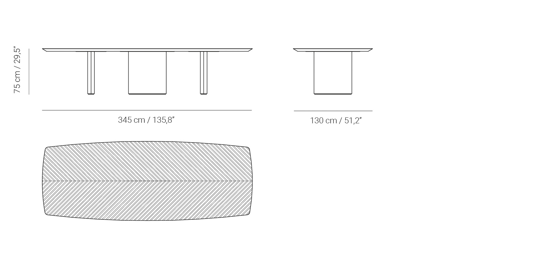 The WIND 345x130 dining table by Jacobo Ventura makes a statement of sophistication and presence. Its large oak marquetry herringbone top showcases the perfect balance between tradition and modern design, while the three metal bases, the central one placed perpendicularly, create a striking sculptural composition.