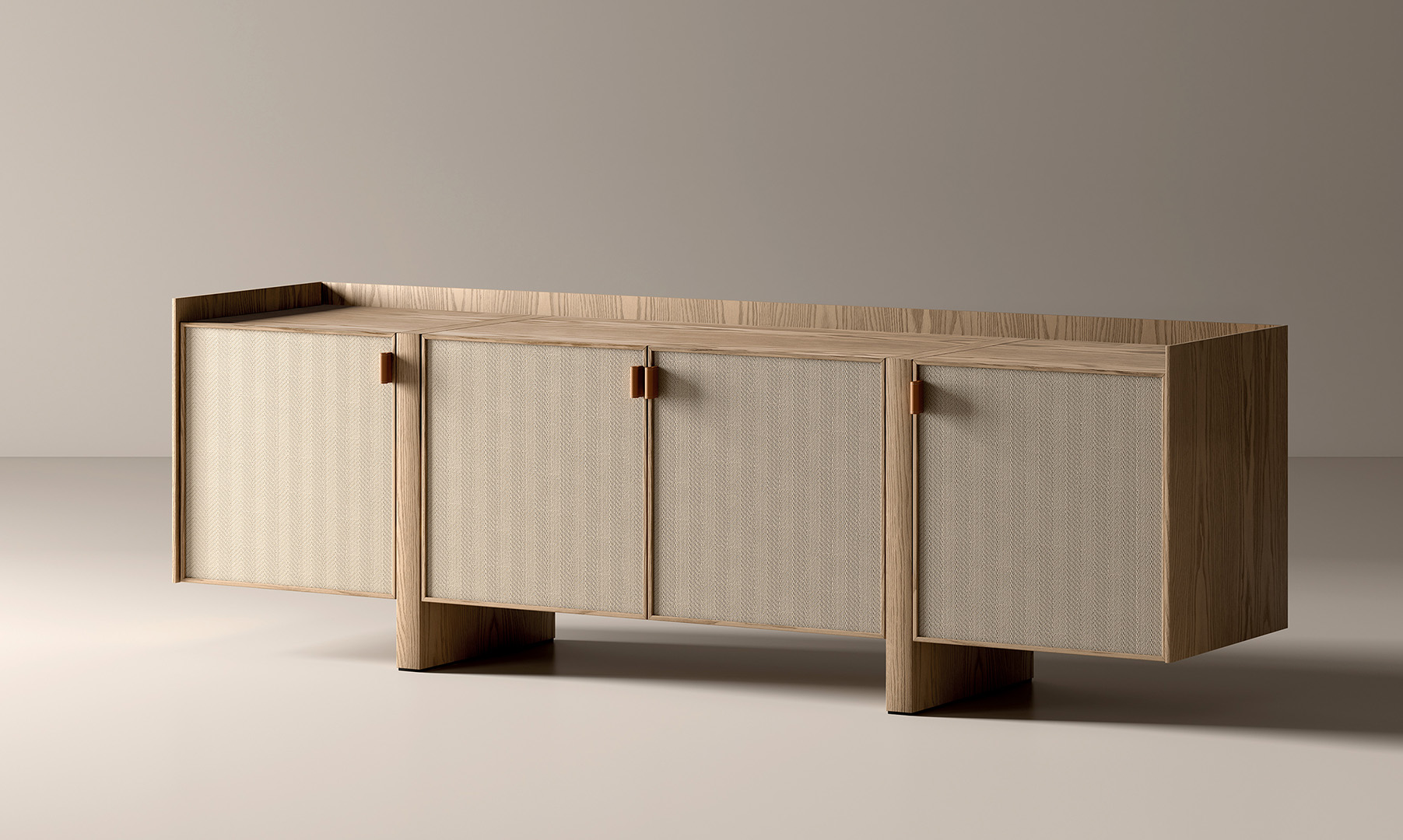 The Roots Nature sideboard captures the essence of the collection - a refined fusion of nature, craftsmanship and contemporary design. Its ash wood structure highlights the beauty of natural grain, while the fabric-covered fronts recall the texture of hand-woven leather craft.