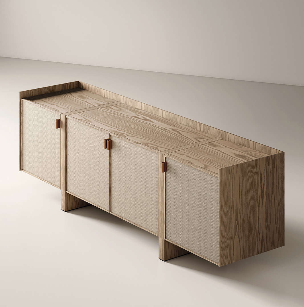 Natural leather handles introduce a tactile and sophisticated detail, reinforcing the artisanal spirit of the piece. The result is a calm yet distinctive sideboard designed to elevate elegant living and dining interiors.