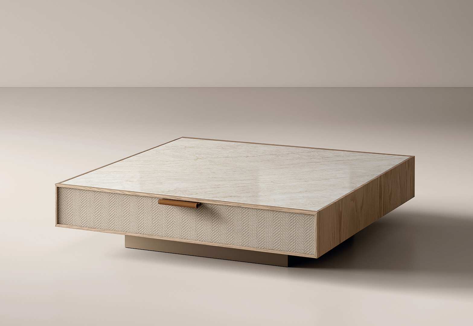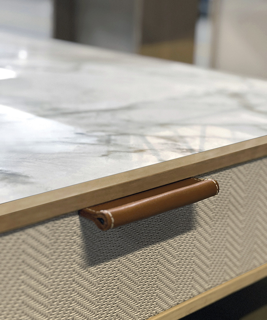 Drawers with fabric-covered fronts echo the look of hand-woven leather craftsmanship, adding texture and character. Natural leather handles complete the design with a subtle yet luxurious detail.