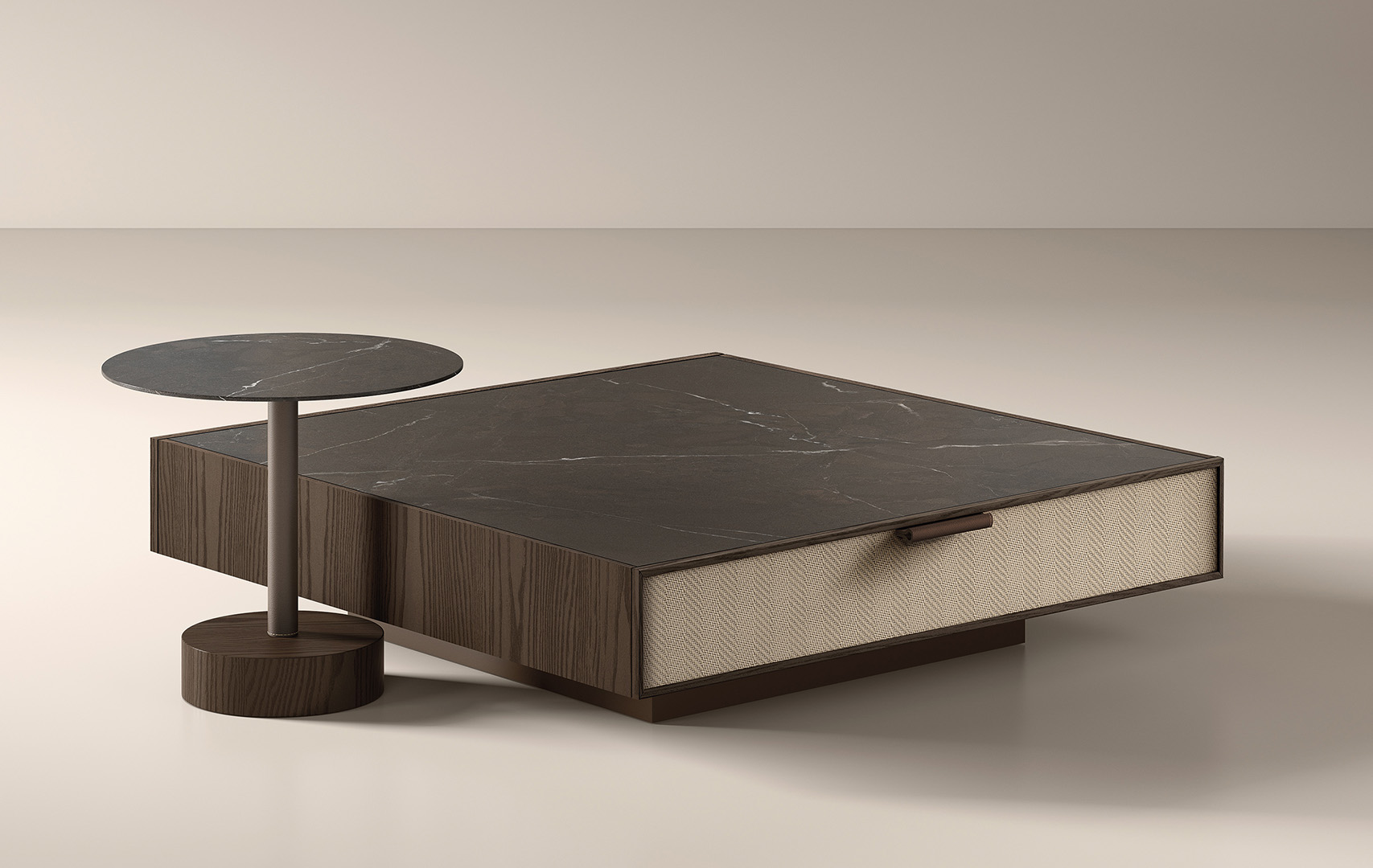 The Roots coffee table balances contemporary elegance with an artisanal spirit. Its porcelain stoneware top offers a refined and durable surface, ideal for the centre of a sophisticated living room.