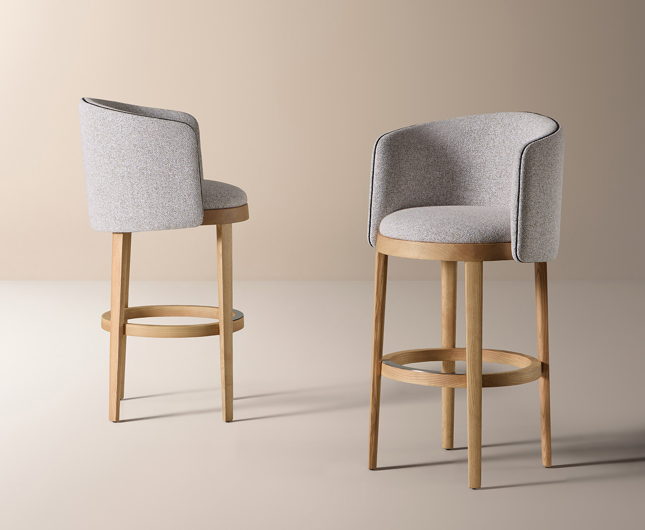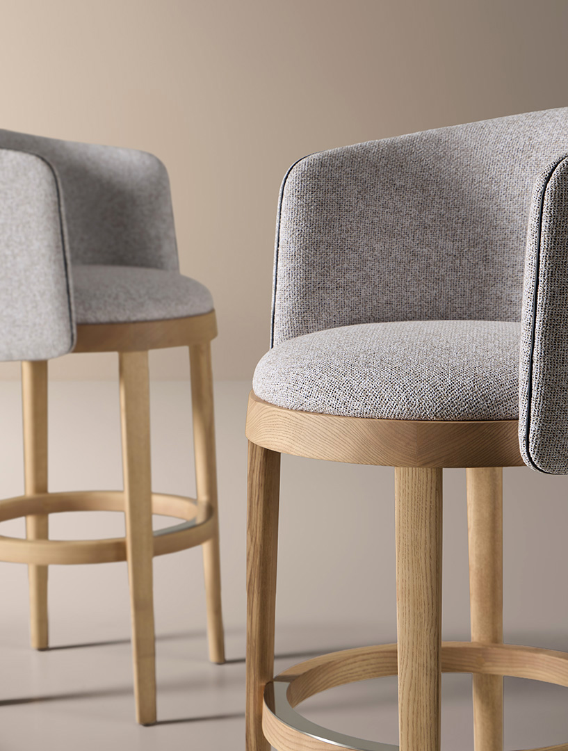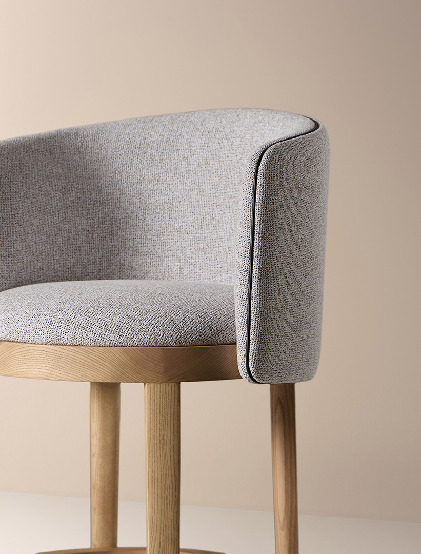 El taburete alto Panarea con respaldo redefine la elegancia en los espacios de bar y cocina. Su diseño estructural, en madera de fresno personalizable, se complementa con un asiento tapizado que ofrece un equilibrio perfecto entre confort y sofisticación. El respaldo envolvente aporta un soporte ergonómico, mientras que los ribetes en ecopiel enfatizan su precisión artesanal.
