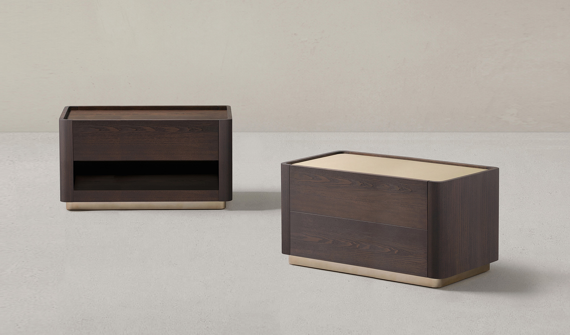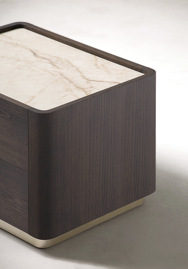 Realizada en fresno, ofrece diferentes acabados personalizables que permiten integrarla con facilidad en dormitorios contemporáneos. La opción de tapa superior en piel natural o porcelánico añade un matiz de lujo y distinción, adaptándose tanto a ambientes cálidos como más sofisticados.