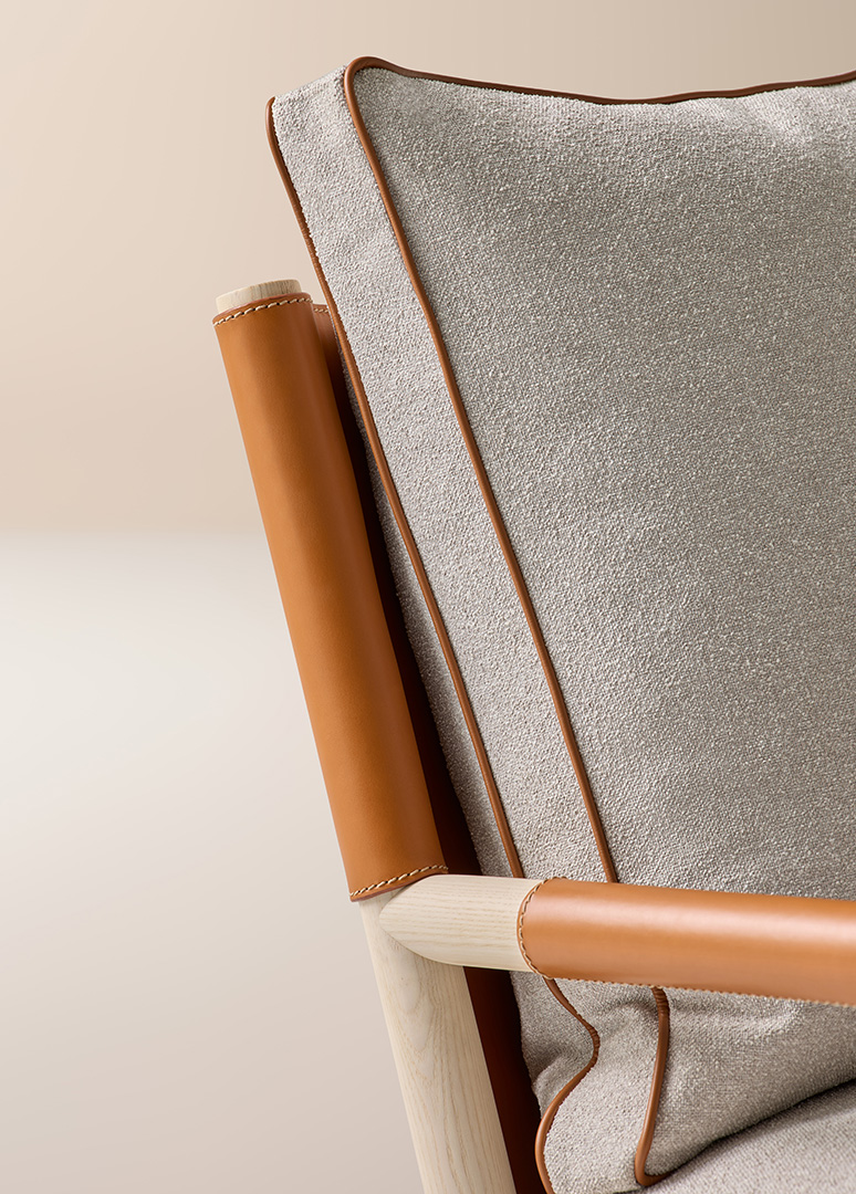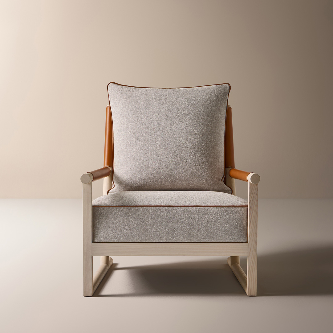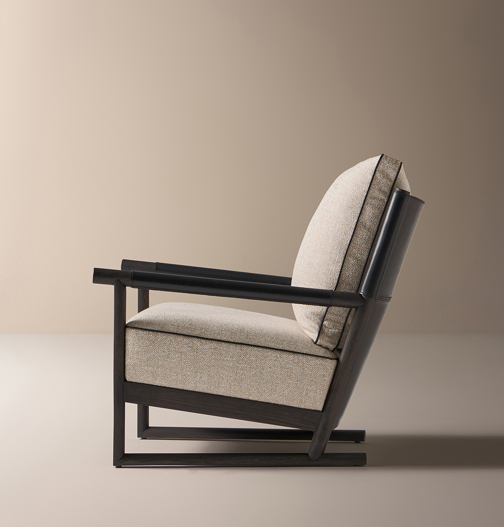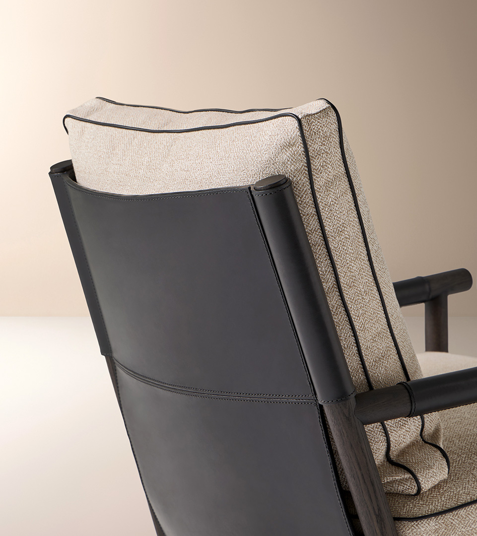 El sillón de salón Ischia es una pieza que equilibra contrastes refinados: solidez y ligereza, arquitectura y confort, esencialidad y riqueza de detalles. Su estructura de madera maciza de fresno crea un juego de líneas inclinadas y uniones precisas que enmarcan el asiento y el respaldo de cuero, tapizados en una cuidada selección de telas o pieles.