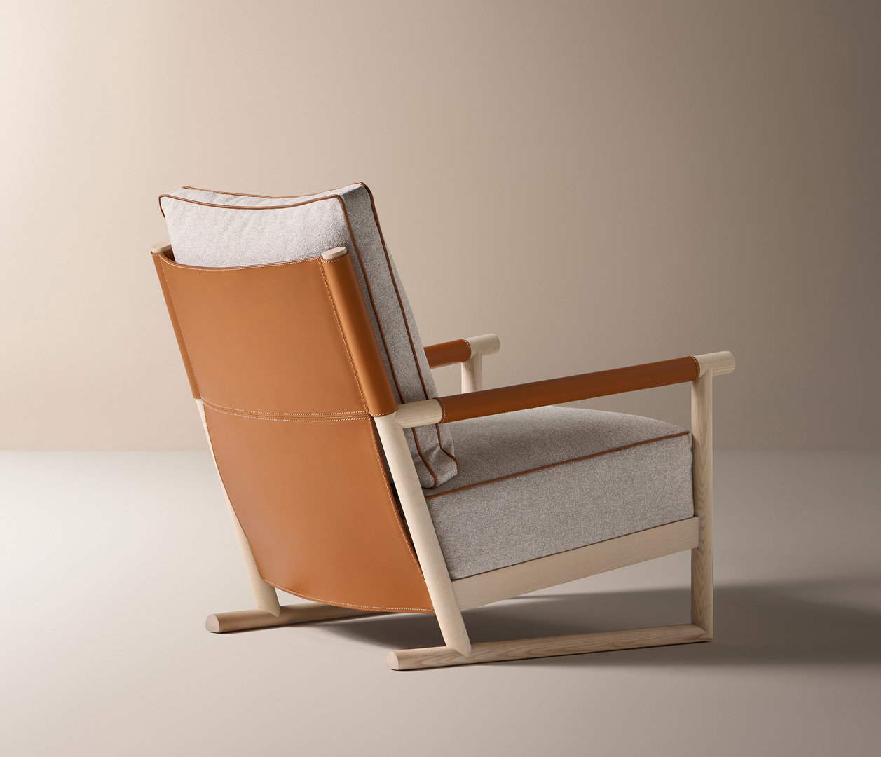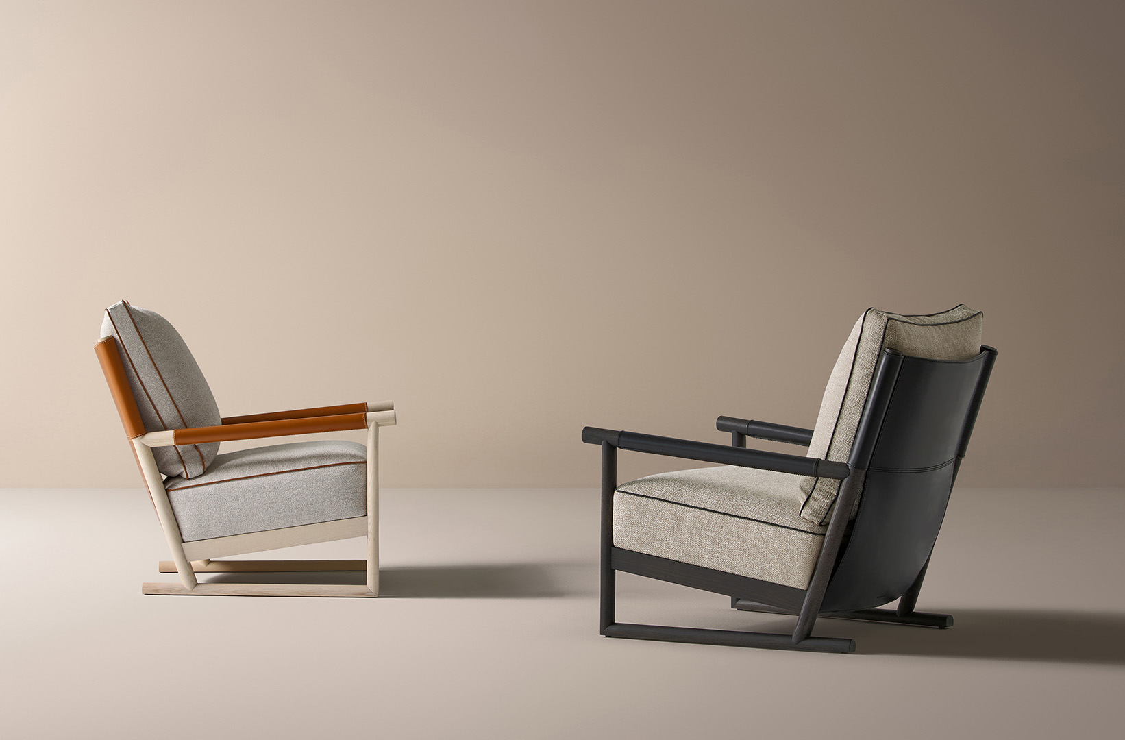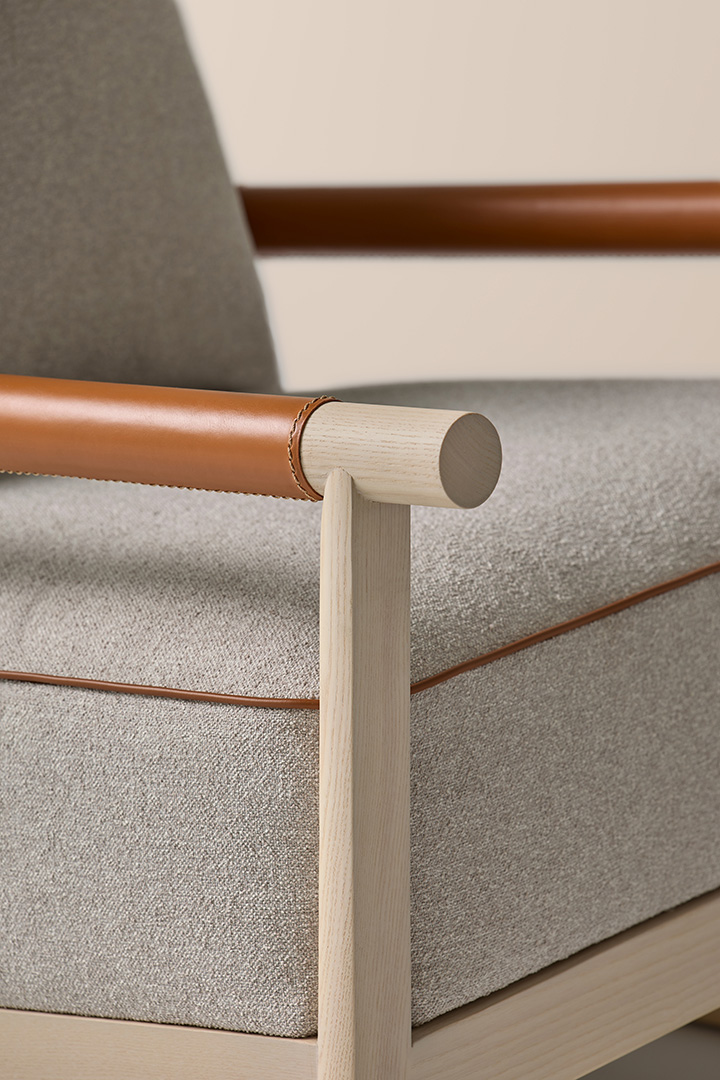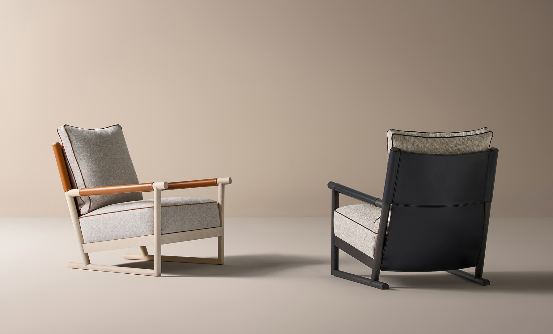 El sillón de salón Ischia es una pieza que equilibra contrastes refinados: solidez y ligereza, arquitectura y confort, esencialidad y riqueza de detalles. Su estructura de madera maciza de fresno crea un juego de líneas inclinadas y uniones precisas que enmarcan el asiento y el respaldo de cuero, tapizados en una cuidada selección de telas o pieles.