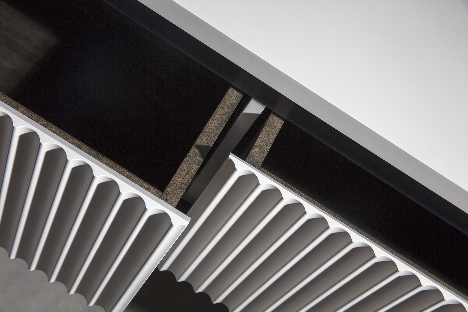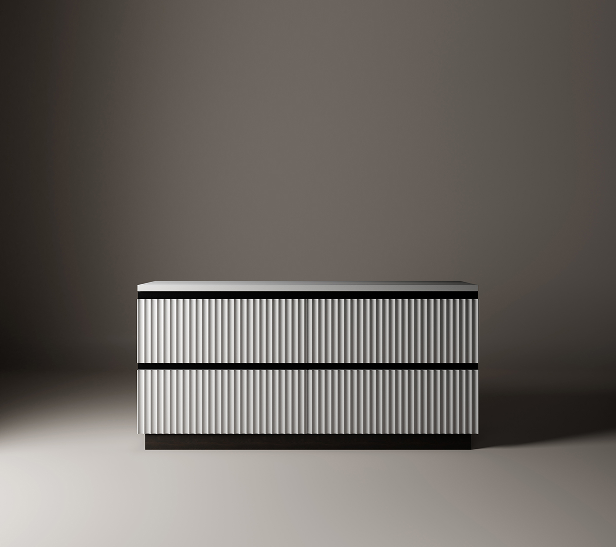 The deep-ribbed front hides four large drawers with interior ebony finish, highlighted by an elegant metal trim while sitting on long, straight, wooden legs. With three satin lacquered finishes to choose from for the front and four different finishes for the legs and details.