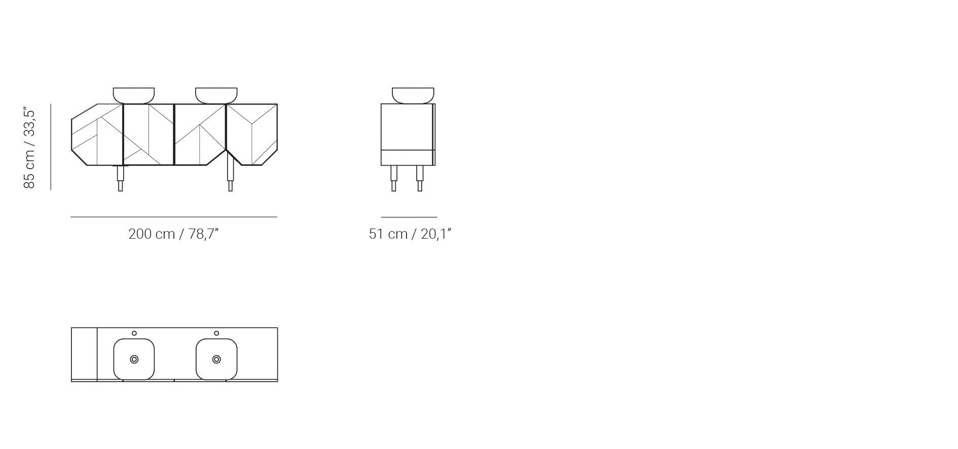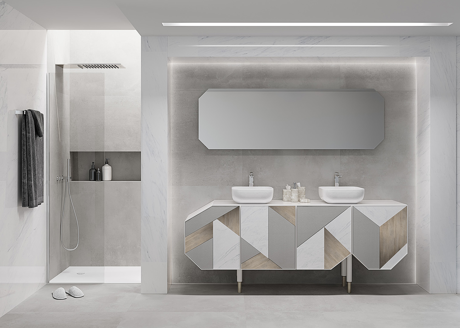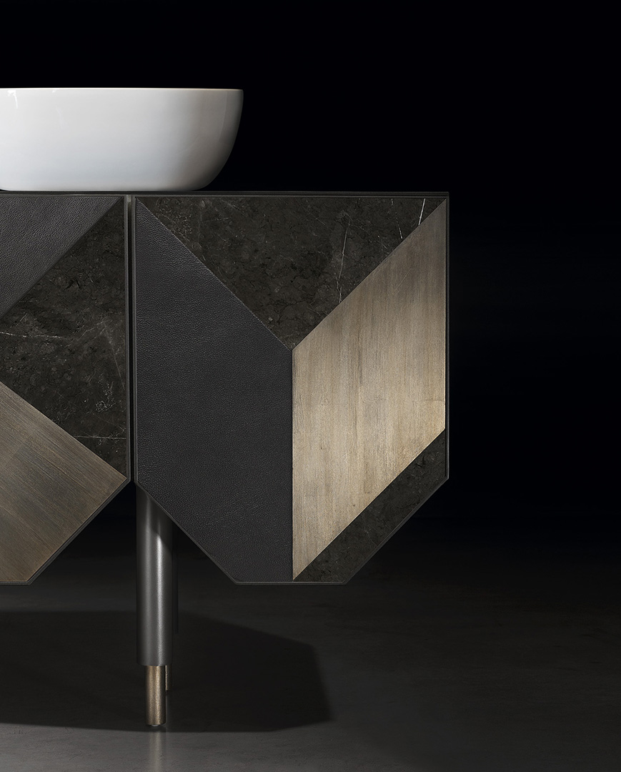 El mueble de baño doble George es de corte clásico poco convencional. Sus formas angulares asimétricos le dan un aire moderno. Disponible un una combinación de tonos claro, con la estructura en blanco perlado, la encimera Lush Withe y la combinación de las puertas en tonos claros y neutros. Para más atrevidos, estructura en gris grafito, encimera Savage Dark y las puertas en tonos oscuros matizados con neutros. El frontal de las puertas combina una trama geométrica de paneles de piel, madera, cerámica y lacados de alta calidad, hechos a medida en un proceso totalmente artesanal. El acabado en lacado brillo de su estructura armoniza con la encimera de porcelánico, siguiendo el contraste de materiales, al igual que en el juego de las puertas. Es un mueble con gran capacidad de almacenaje, para poder guardar todos los artículos de tocador y mantener el baño siempre en orden. El interior está configurado con estantes fijos. Las puertas llevan bisagras que permiten una apertura de 110º y el cierre amortiguado. Se complementa con dos lavabos y grifos de sobre encimera, no incluidos. Consulte nuestra selección de accesorios de baño.