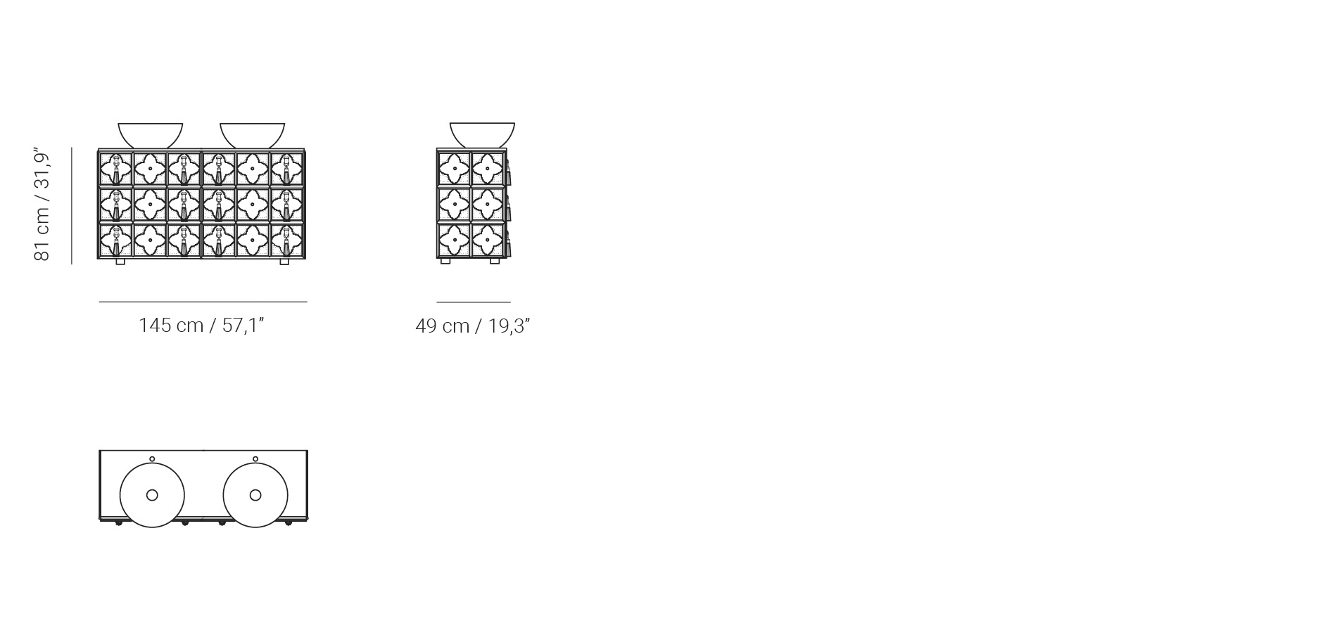 El mueble de baño doble VALENTINA con seis cajones evoca sentimientos que nos trasladan tanto a la estética de los zapatos clásicos como al mundo del caballo, ya sea por los materiales utilizados, como las técnicas tradicionales de corte en la piel empleada, como por ejemplo el festón.