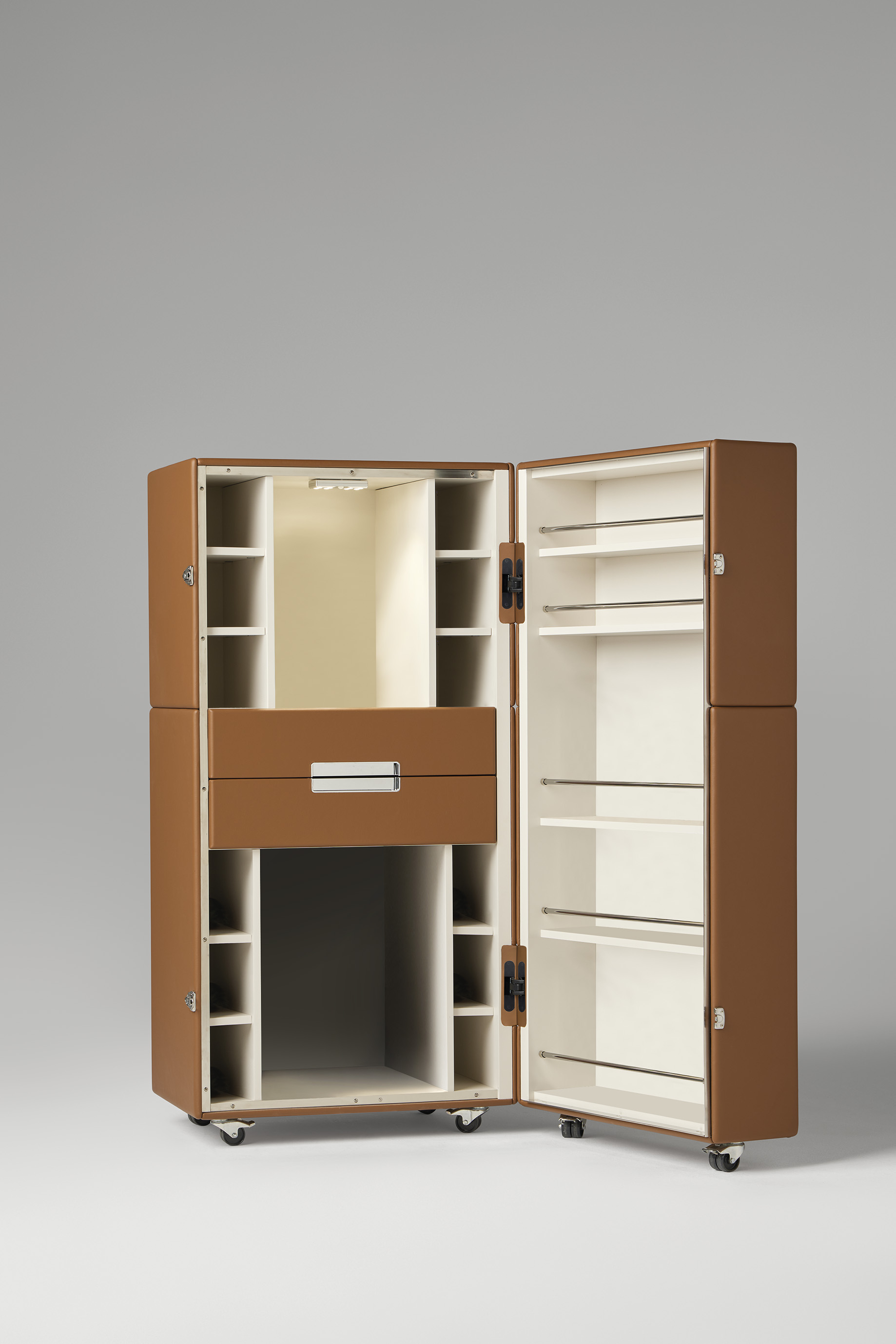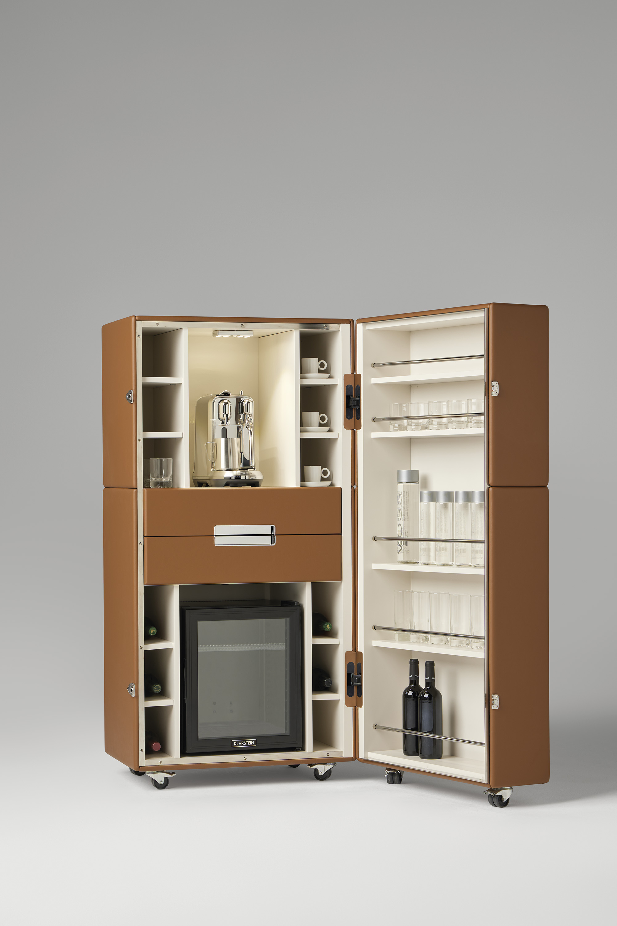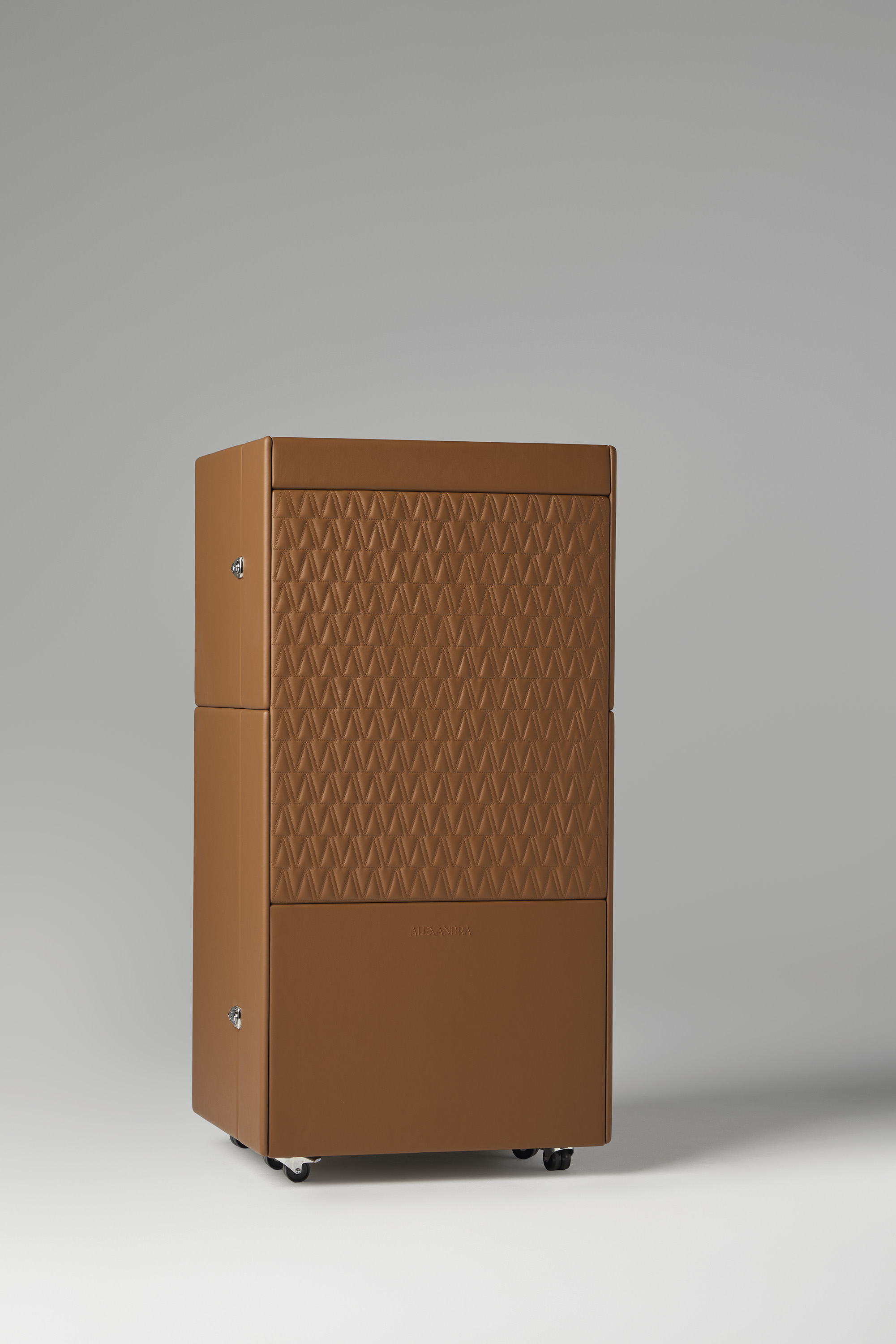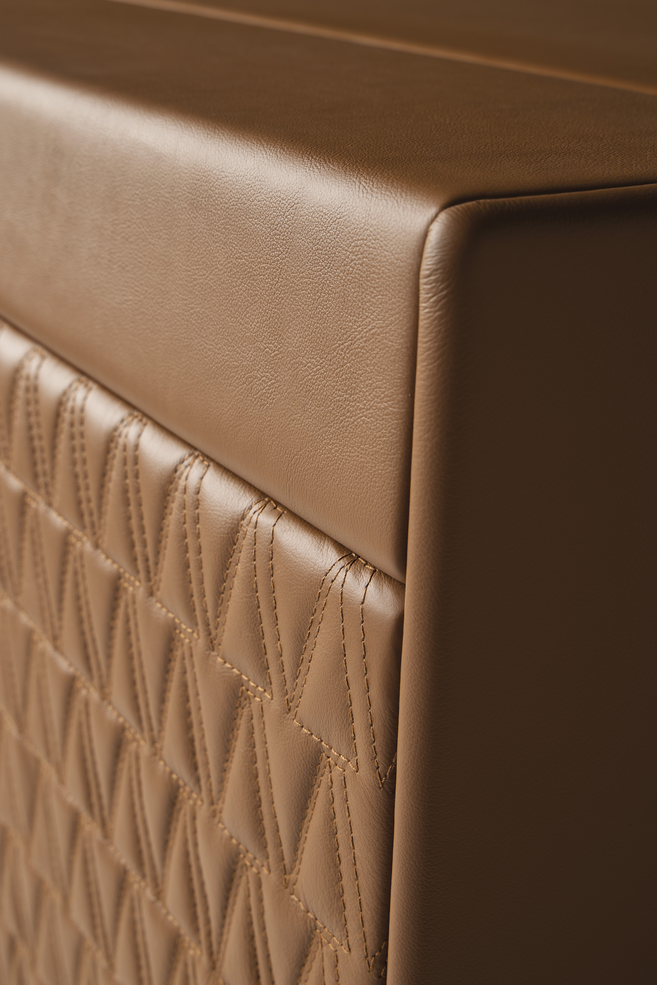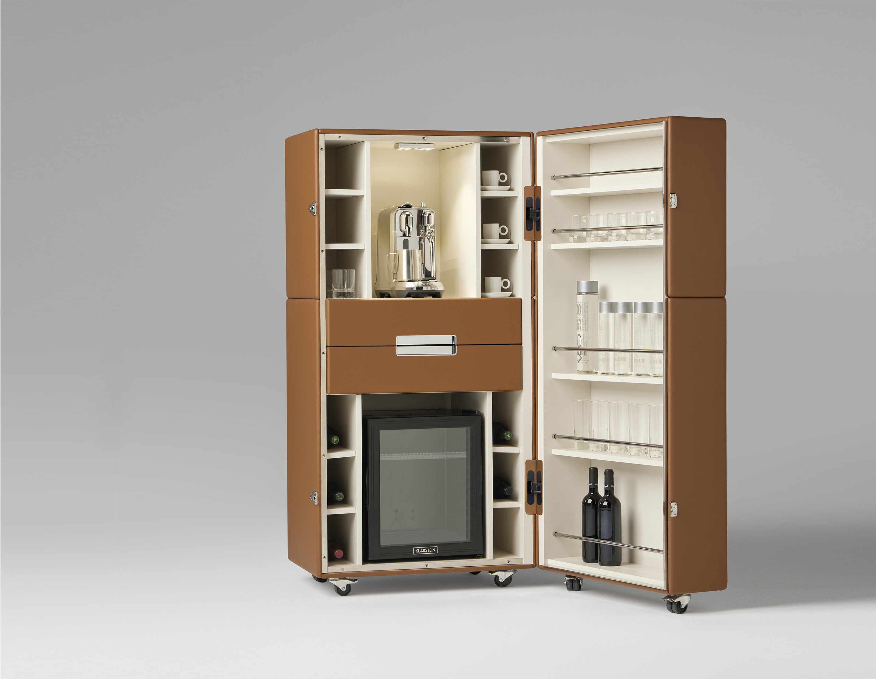 El interior se puede lacar en una variada selección de tonos que permite crear juegos cromáticos al combinarlo con la piel exterior y del cajón. El exterior del armario cafetera está acolchado y forrado en piel de alta calidad, combina piel lisa con piel bordada. Dispone dos cierres que permiten cerrar el mueble con llave.