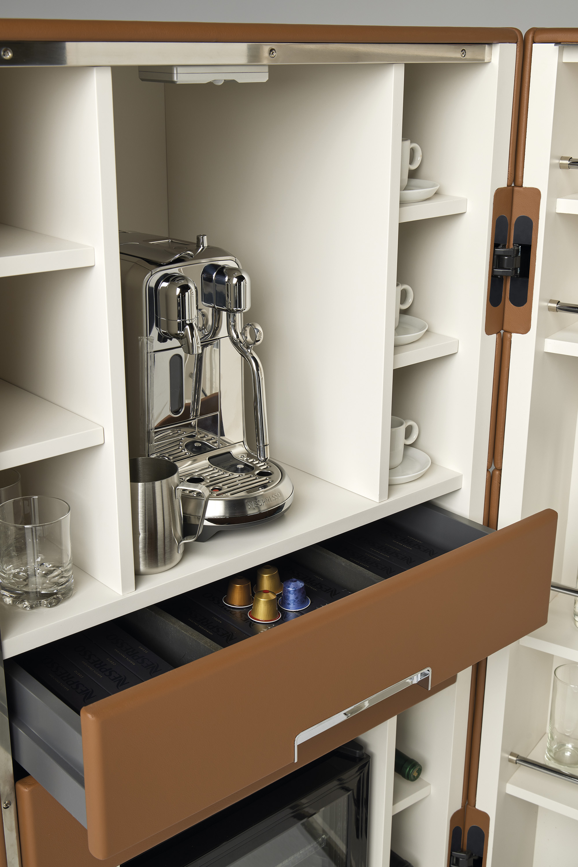 El interior del armario está dividido en tres secciones. La superior tiene un módulo central para la cafetera y dos estanterías laterales para tazas. En la sección media hay dos cajones, con el frontal forrado en piel y tiradores embutidos en cromo brillo, perfectos para guardar las cápsulas de café, cucharitas, sacacorchos y resto de menaje. La distribución de la parte inferior mantiene la simetría con la superior, está pensada para albergar una nevera y estantes para colocar botellas horizontalmente, como por ejemplo el vino que se conserva mejor en esta posición.