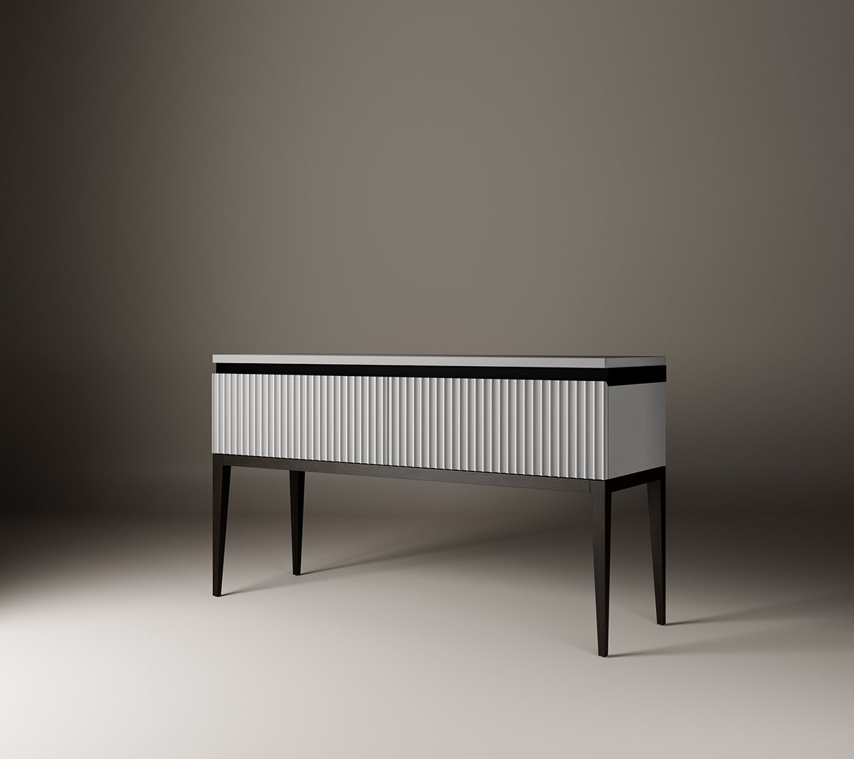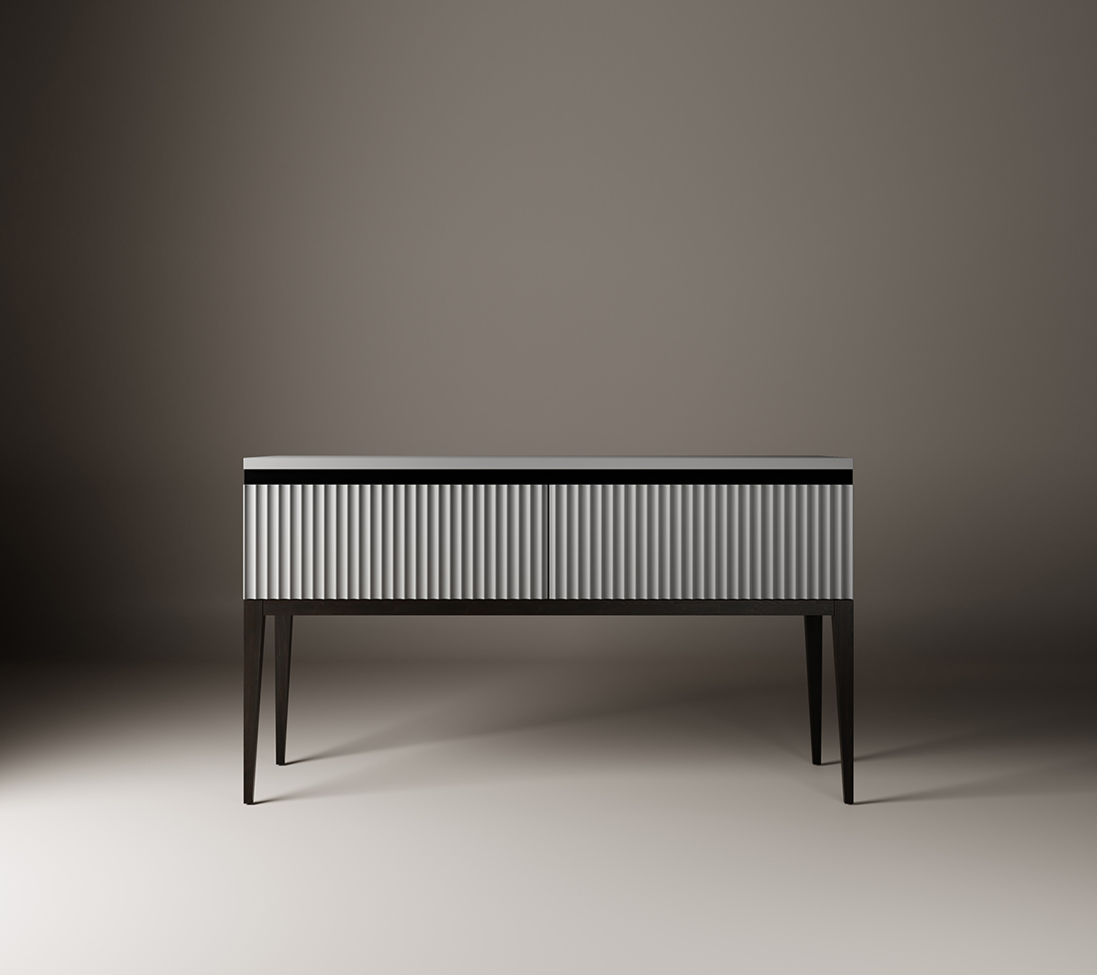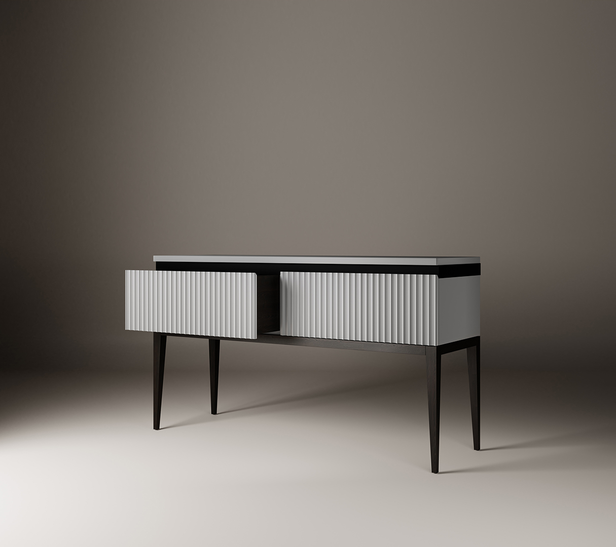 La elegante consola Mercury XL, de estilo mid-century, es un práctico mueble que se puede integrar en cualquier espacio. Ideal para salones modernos, recibidores con personalidad o dormitorios minimalistas. Los frentes acanalados esconden dos amplios cajones con el interior acabado en ébano y están resaltados por elegante detalle metálico aplicado en el contorno de la estructura.