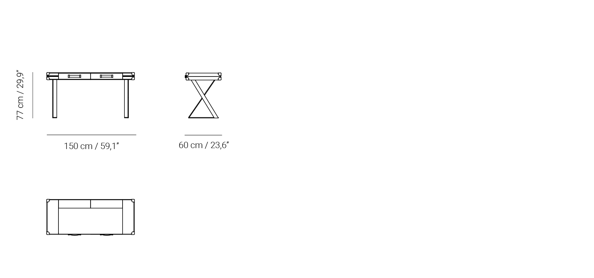 Posee dos modestos cajones ideales para documentos que añaden un plus de funcionalidad. Se ha cuidado con especial atención los detalles, como los tiradores de cuero de los cajones con forma de correa o las cantoneras de piel remachadas con chinchetas. Las patas están formadas por dos aspas metálicas para las que recomendamos el negro texturado como acabado estándar.