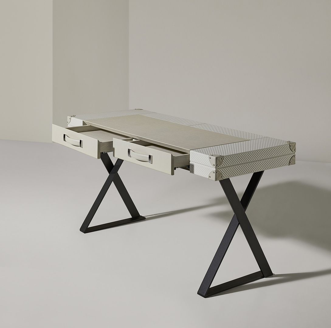 El escritorio moderno Traveler tiene porte ligero con un diseño elegante. Ideal para despachos de lujo con un aire sofisticado que buscan el minimalismo en su decoración. Las antiguas maletas de viaje han servido de inspiración a Jacobo Ventura para diseñar este funcional a la vez que estético escritorio. La parte superior tiene un vade central forrado en ecopiel, mientras que el resto del cuerpo se ha trabajado artesanalmente en piel natural grabada, ambos materiales disponibles en una amplia selección de colores.