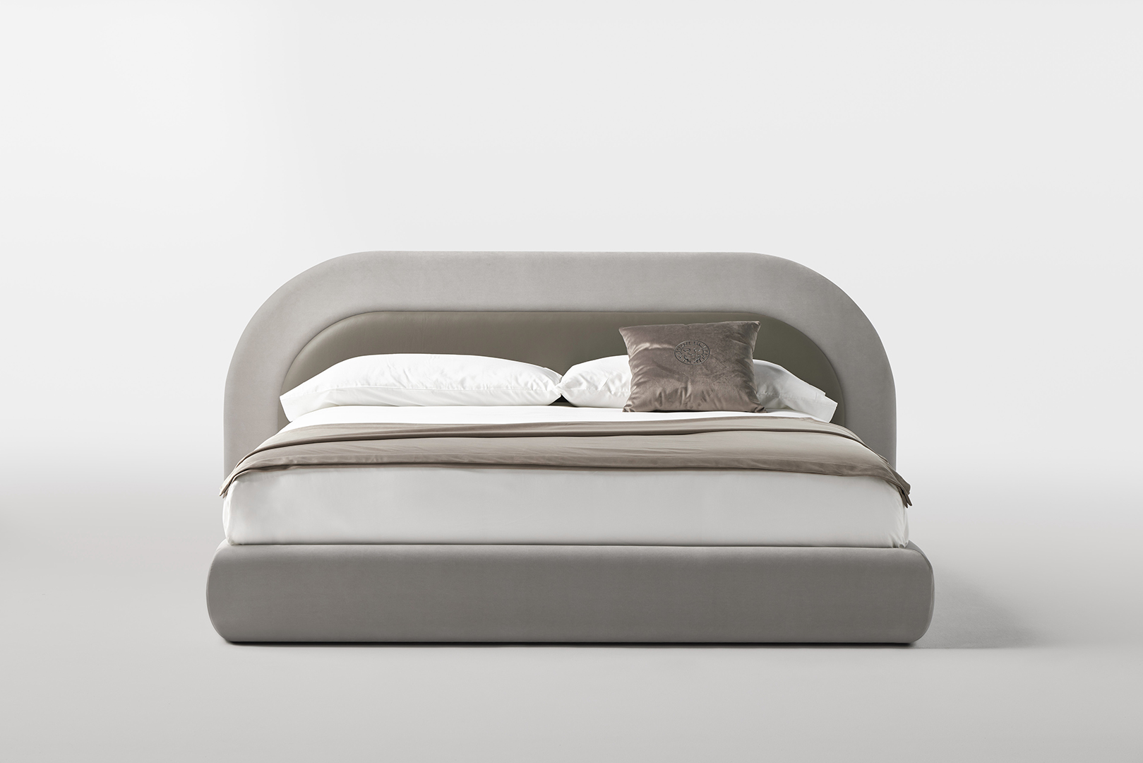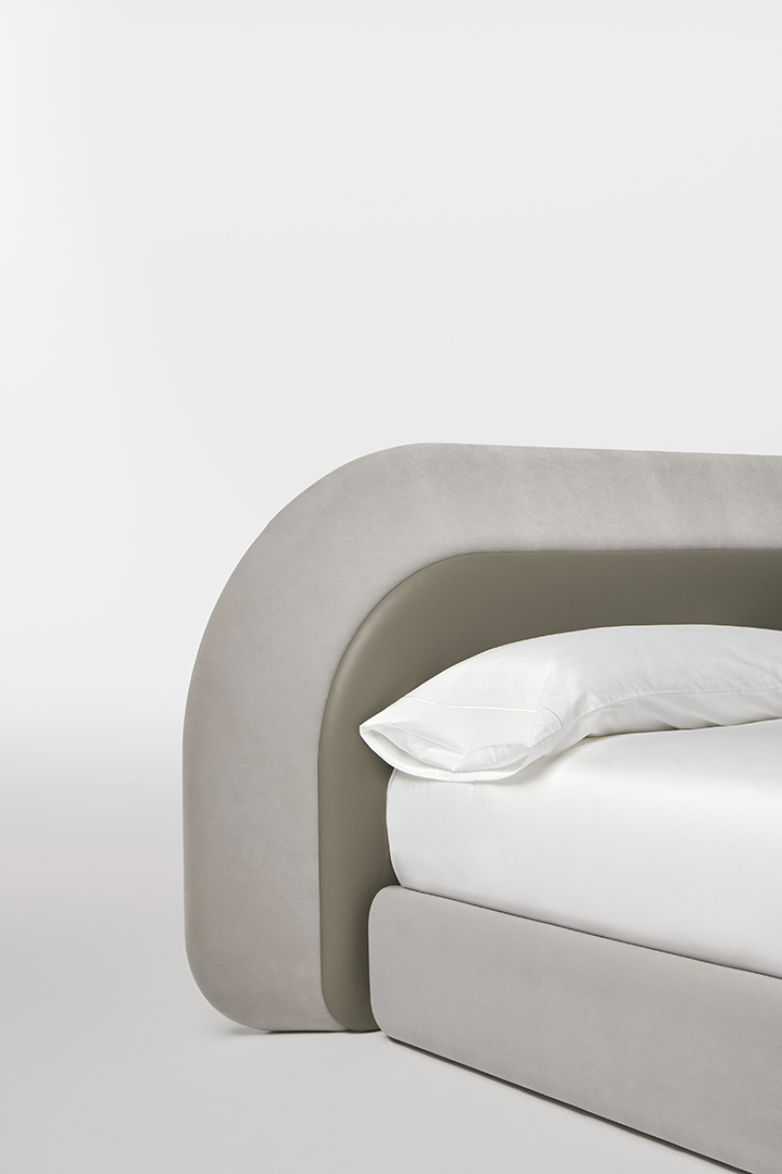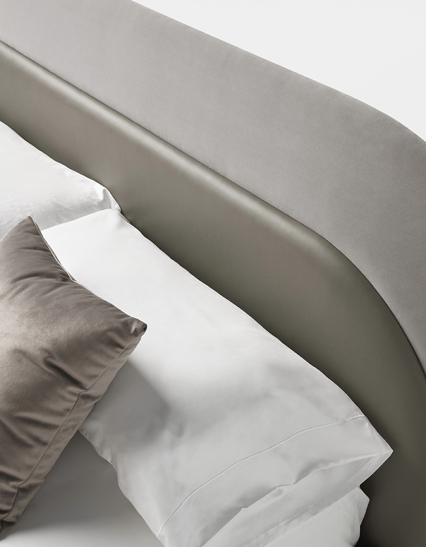 La cama Orient confiere a la zona de descanso un aspecto acogedor y estético. Diseñada por Jacobo Ventura, la cama está formada por un cabecero de líneas curvas, compuesto por un panel central tapizado en piel enmarcado por un ancho borde tapizado en tela.