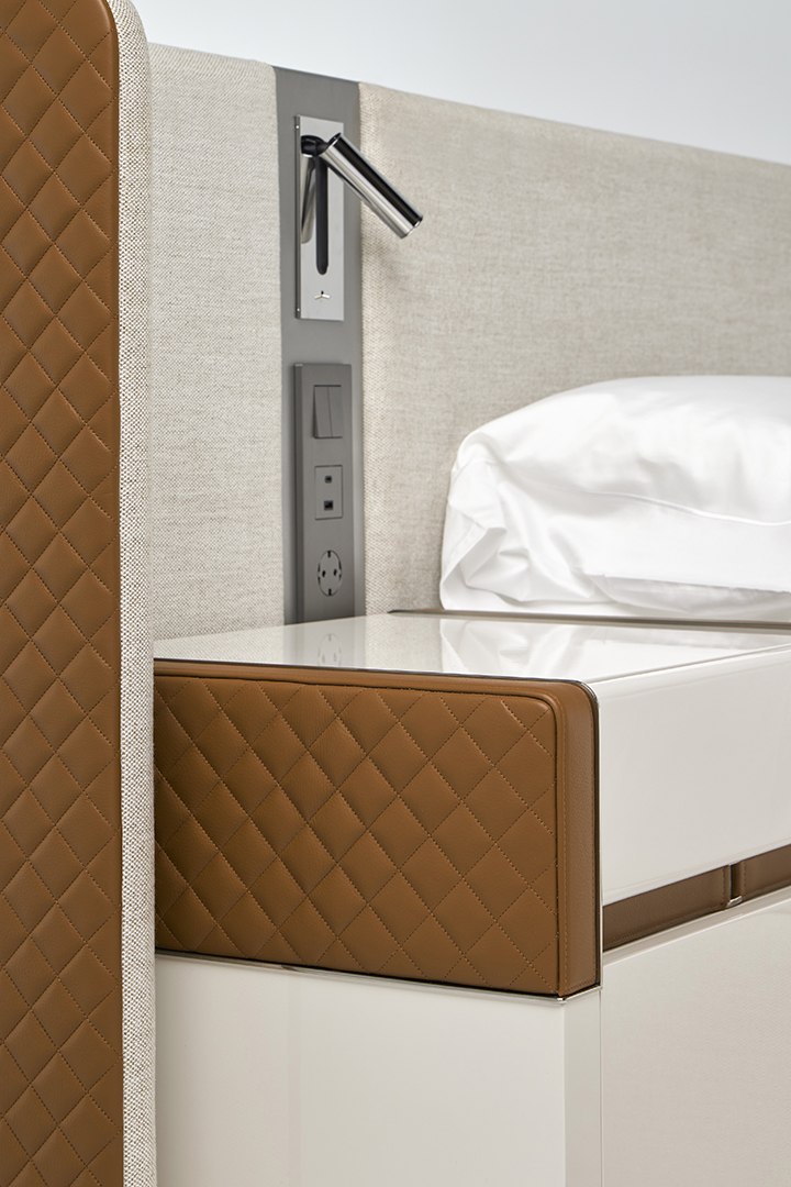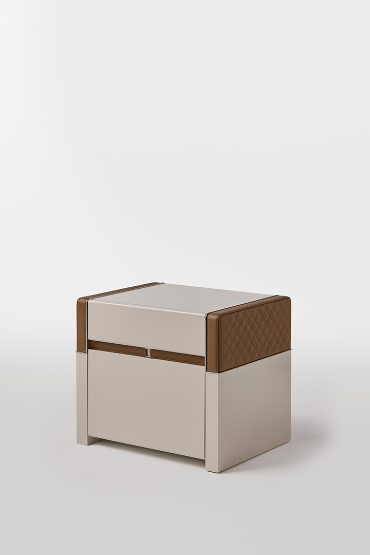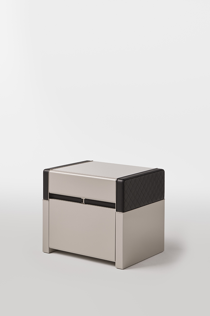 La mesita de noche Master se puede personalizar en múltiples combinaciones de lacados y piel bordada para obtener como resultado una pieza única. Un diseño de Jacobo Ventura para Alexandra que se integra perfectamente en dormitorios de lujo.