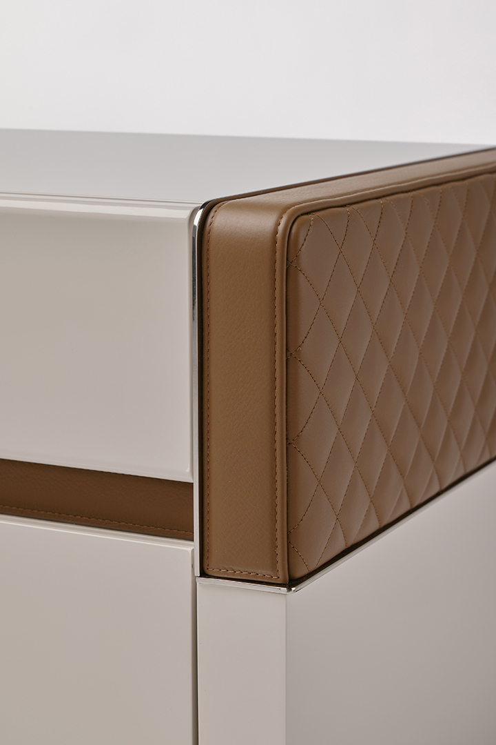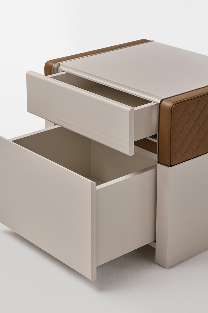 Ideal para acompañar a los diferentes modelos de cama o cabecero y cómoda Master. Una mesita con dos cajones que se caracteriza, al igual que toda la colección, por sus líneas elegantes y sobrias. Las superficies lacadas en alto brillo se encuentran en perfecta sintonía con los detalles de acero y piel bordada.