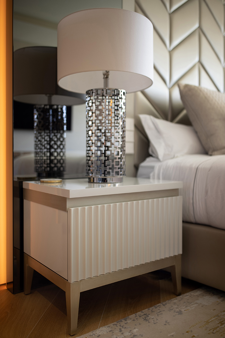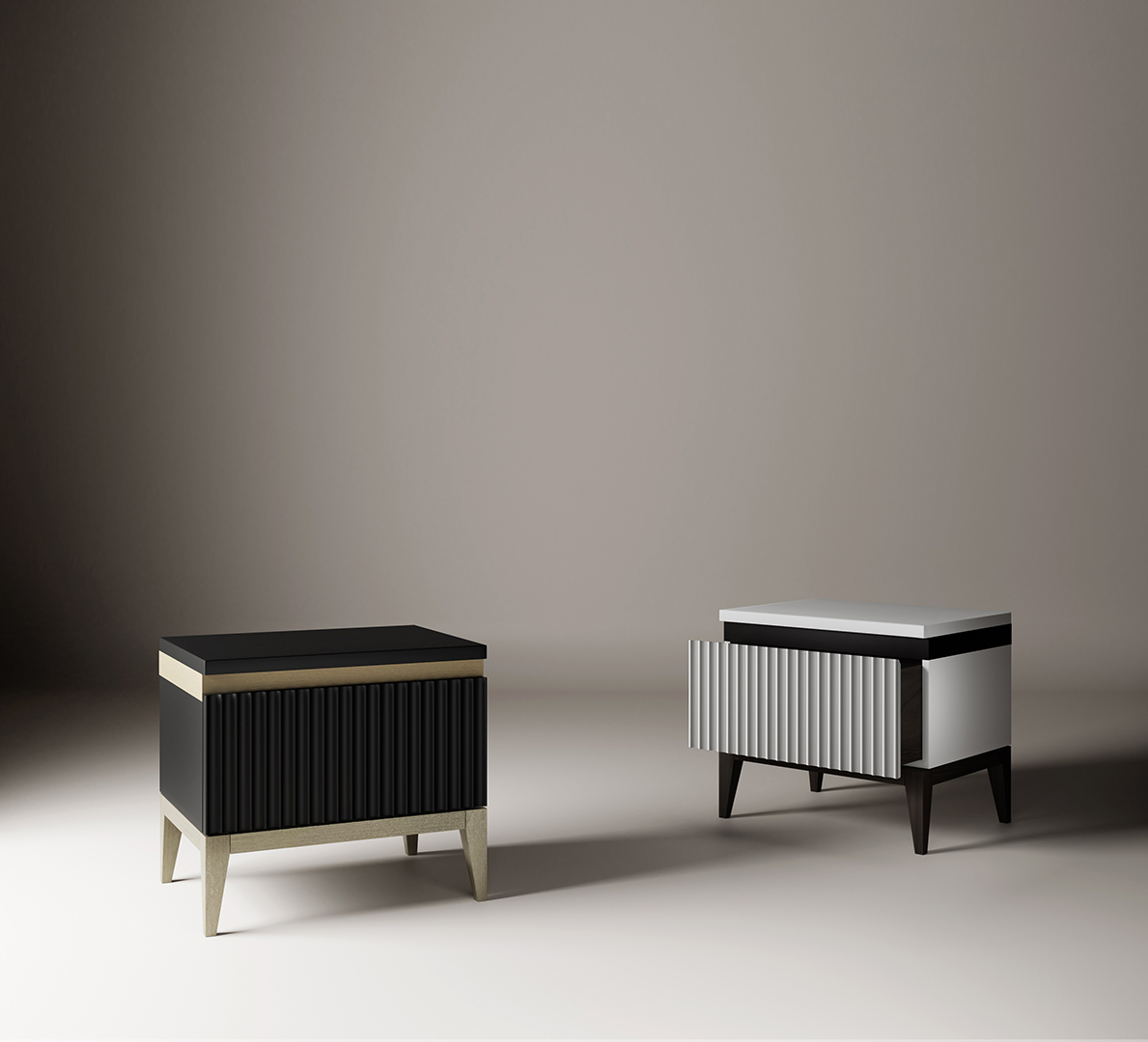 Mercury es una moderna mesita de noche que aporta elegancia y diseño a los dormitorios. Cuenta con un amplio cajón con el frontal decorativo con una trama acanalada, realzado por el detalle de la aplicación metálica en la estructura.