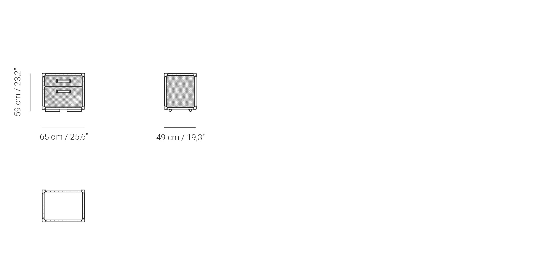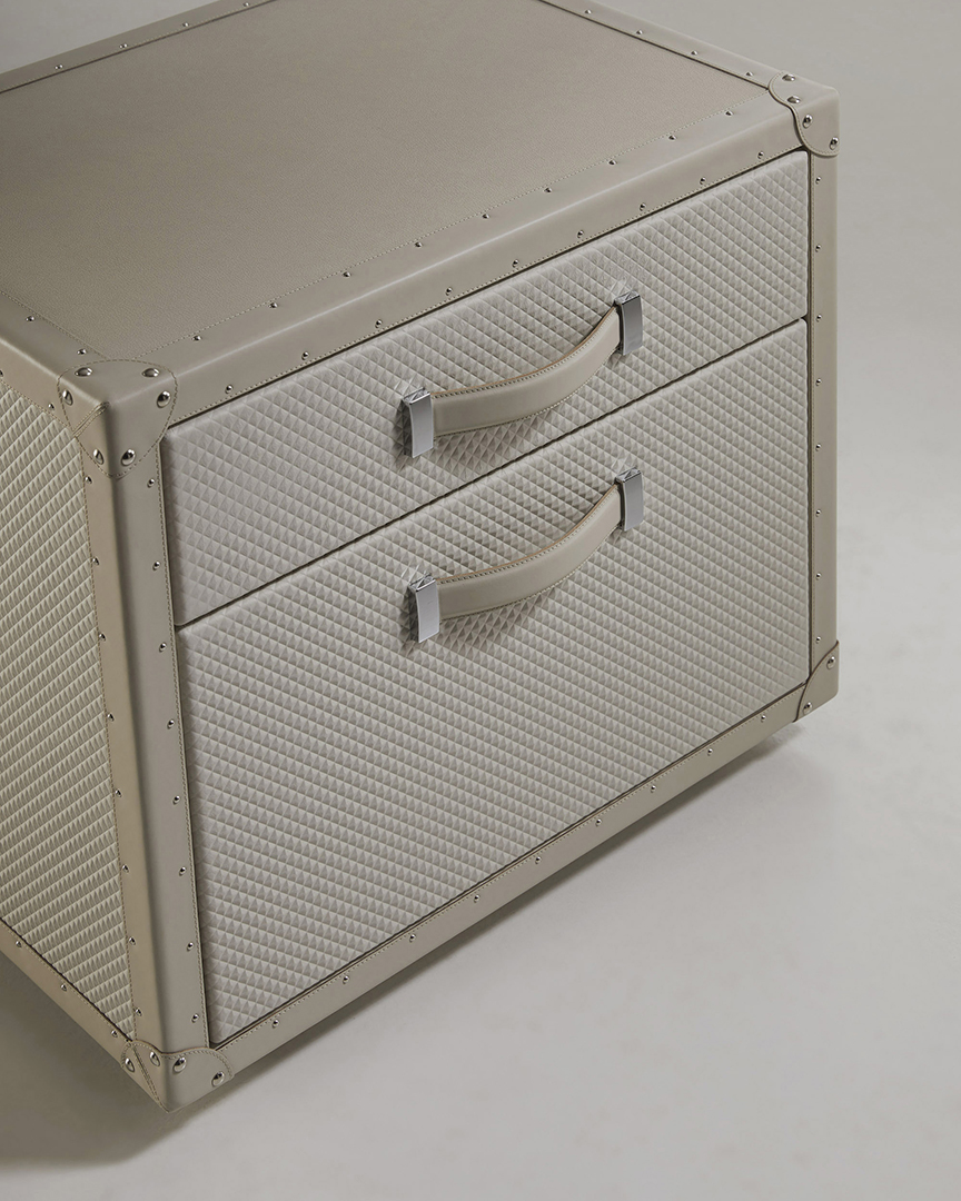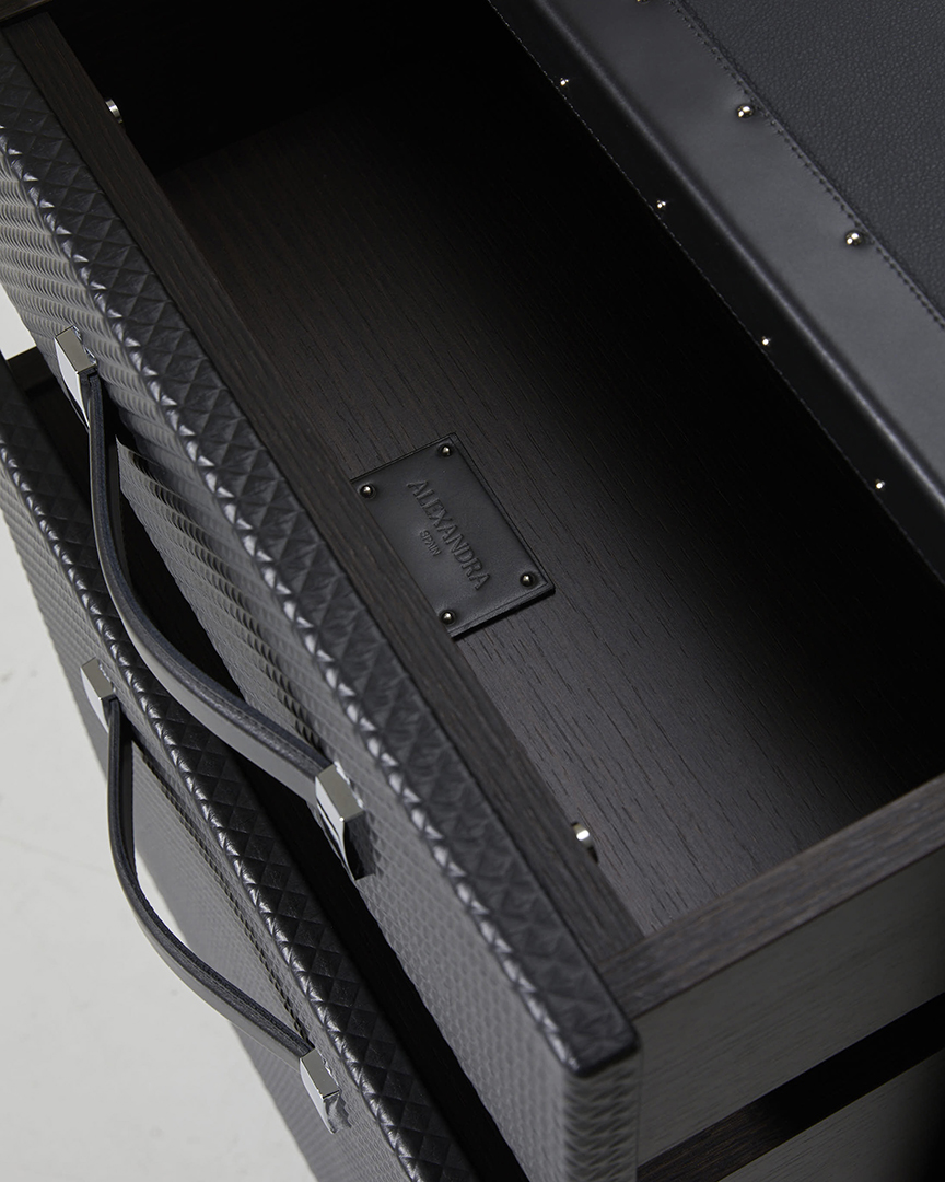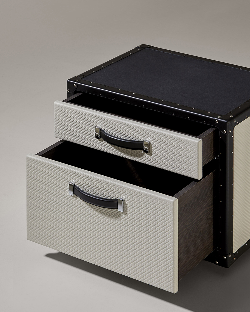 Lleva el lujo al dormitorio con la original mesita de noche Traveler. Jacobo Ventura ha creado un diseño de dos cajones con diferentes volúmenes de capacidad para romper la simetría del mueble. Fabricada con acabados de alta gama y gran calidad, está forrada en piel con un discreto grabado piramidal. La parte superior de la mesa de noche está forrada con una resistente ecopiel lisa. Los tiradores de los cajones recuerdan a las asas de las antiguas maletas. Su estilo es ideal para dormitorios tanto de diseño clásico como contemporáneo. Personalizable en una amplia gama de acabados.