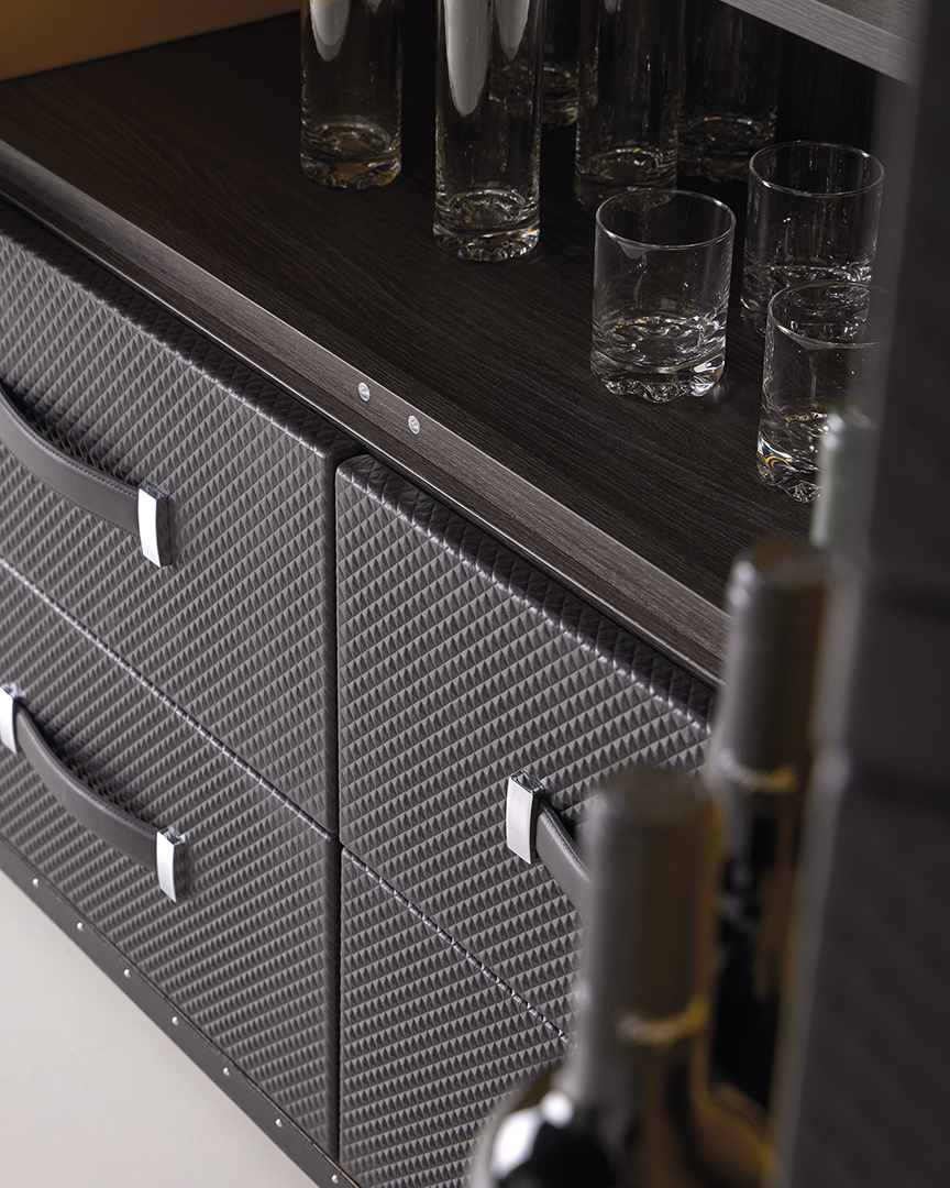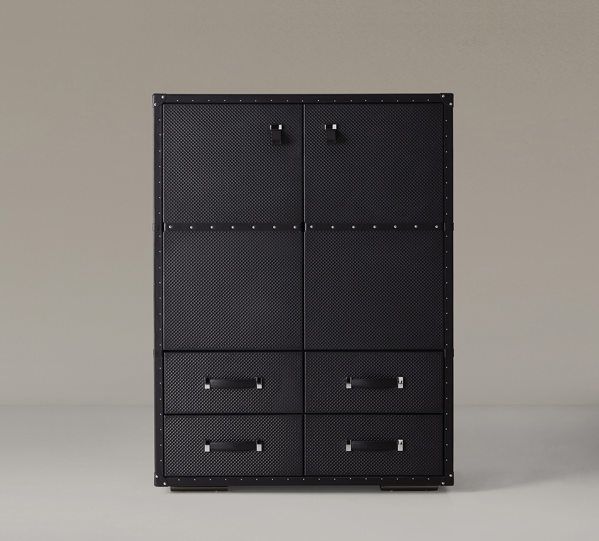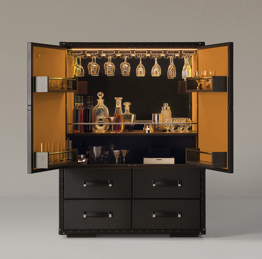 Un armario bajo de dos puertas y cuatro cajones. El exterior está empeletado en piel grabada, disponible en una paleta de más de 40 colores. Decorado con los detalles tan característicos de las maletas, correas y cantoneras de cuero. El interior de las puertas y los laterales interiores están forrados con una resistente ecopiel que se ofrece en una amplia gama de colores. En el fondo del armario se ha colocado un espejo que dar mayor sensación de profundidad. Tiene rieles para colgar copas y baldas con barras cromadas en el interior y en las puertas. Tiene integrada iluminación led.