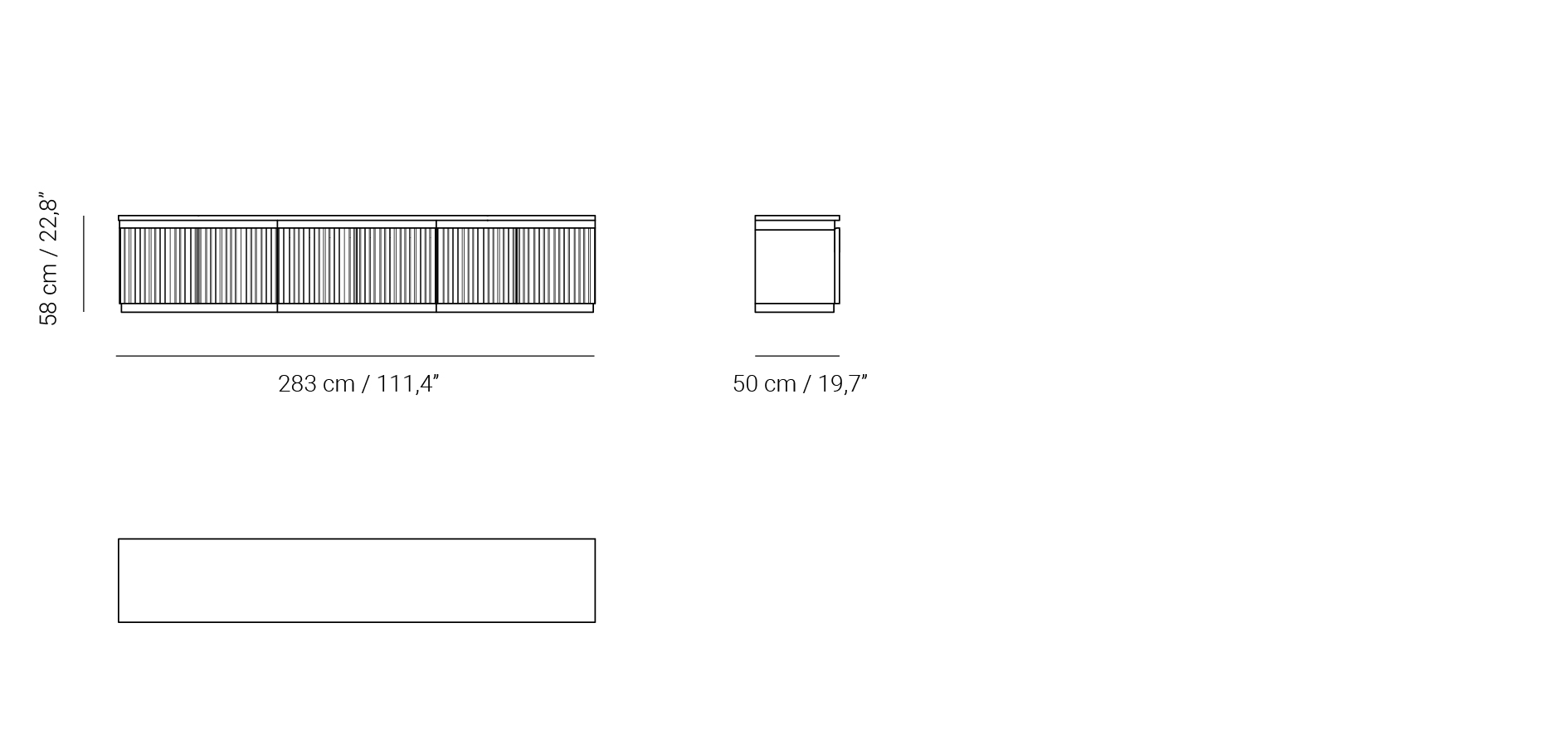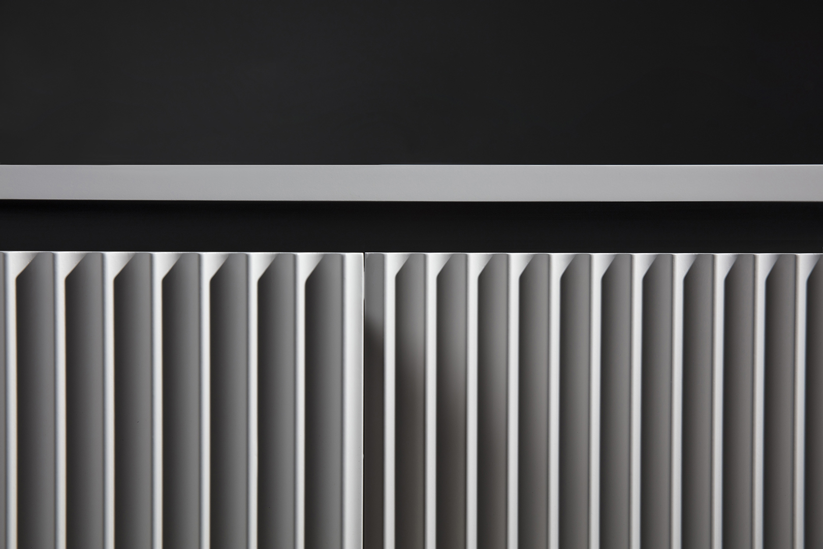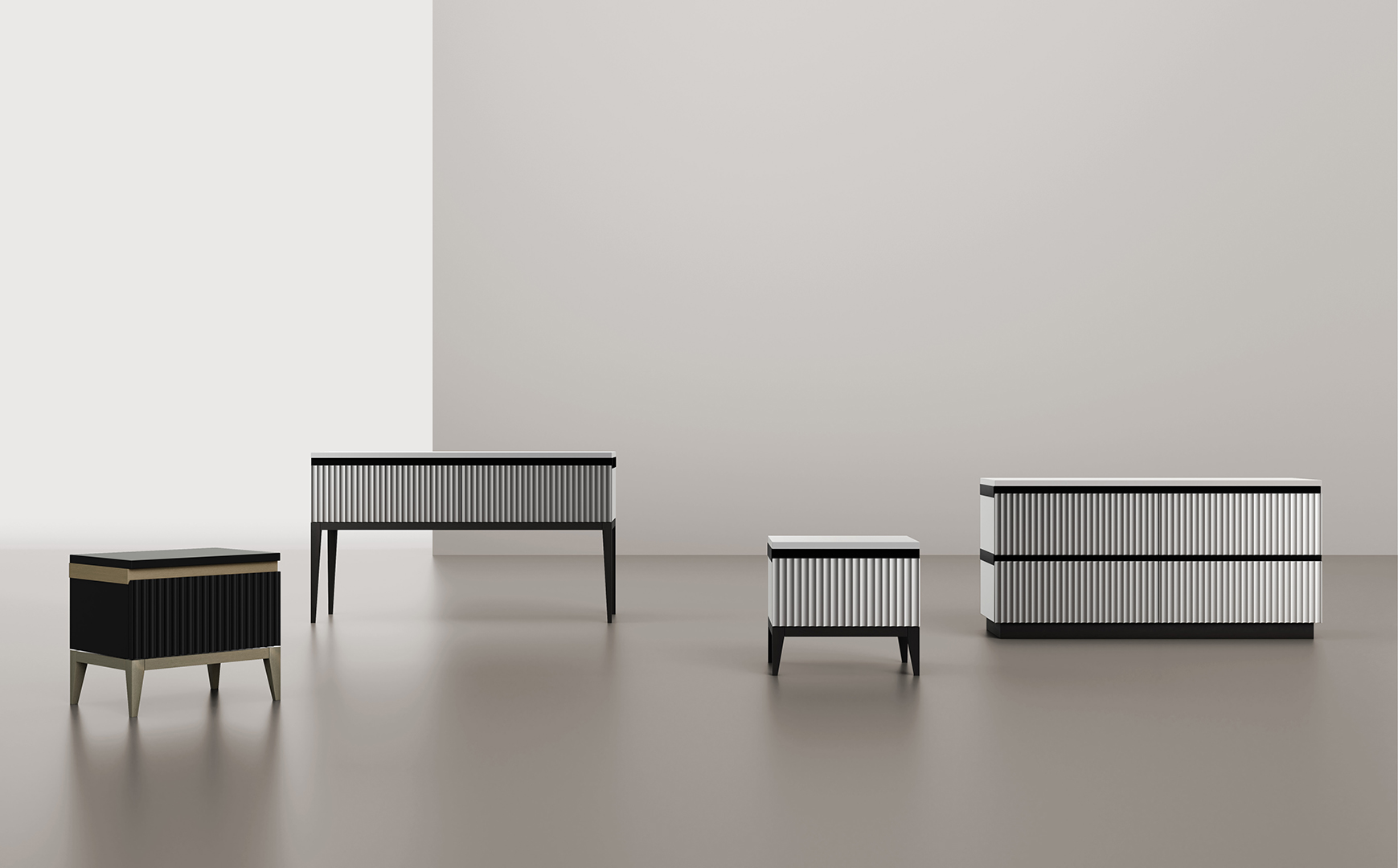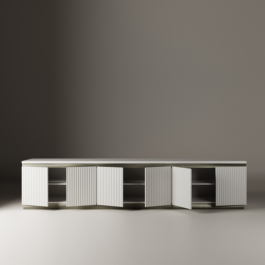 Tiene seis puertas con los frontales acanalados, realzadas por los detalles de las aplicaciones metálicas en la estructura. Opción de acabado principal en tres lacados satinados que combinan con las cuatro opciones para los detalles metálicos y el zócalo de madera