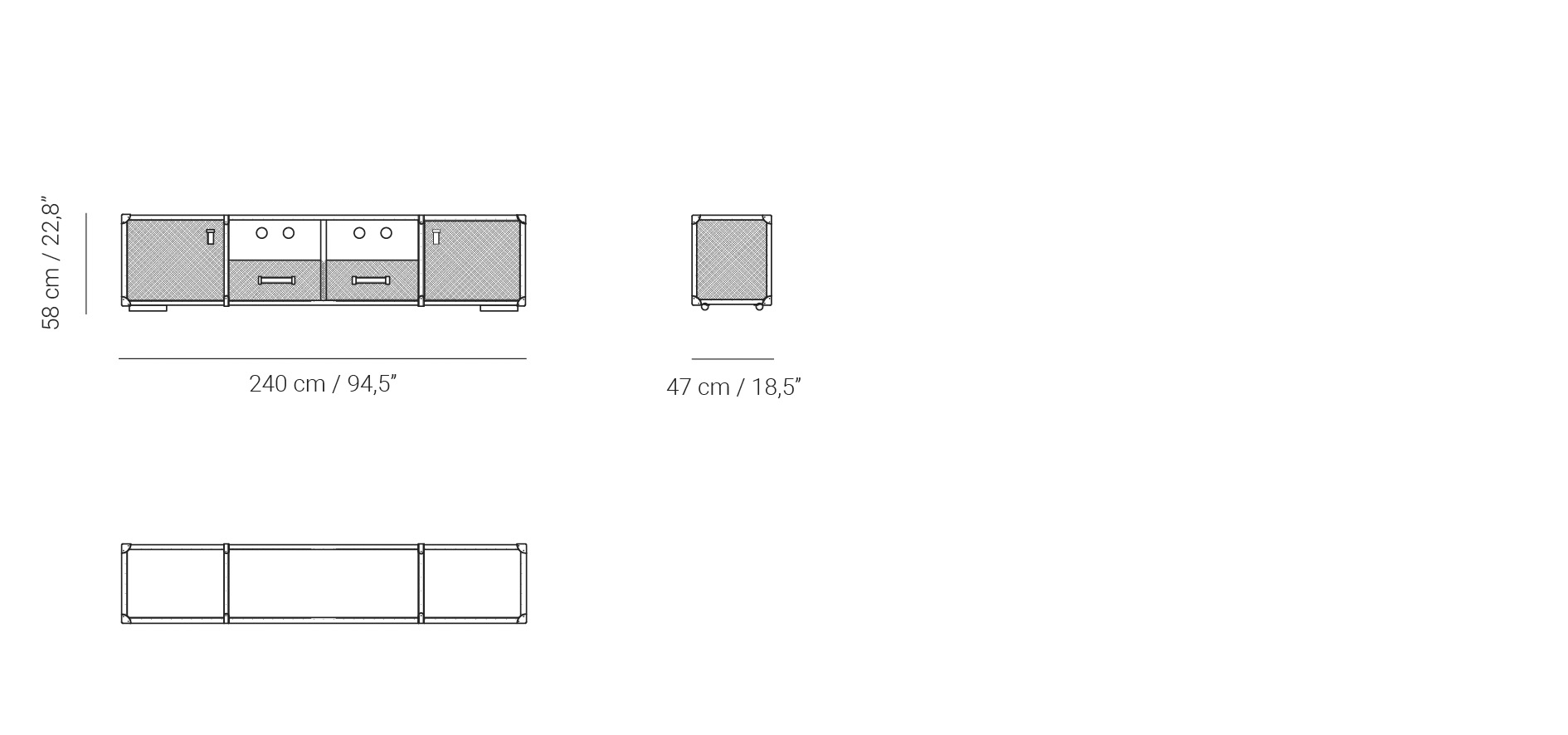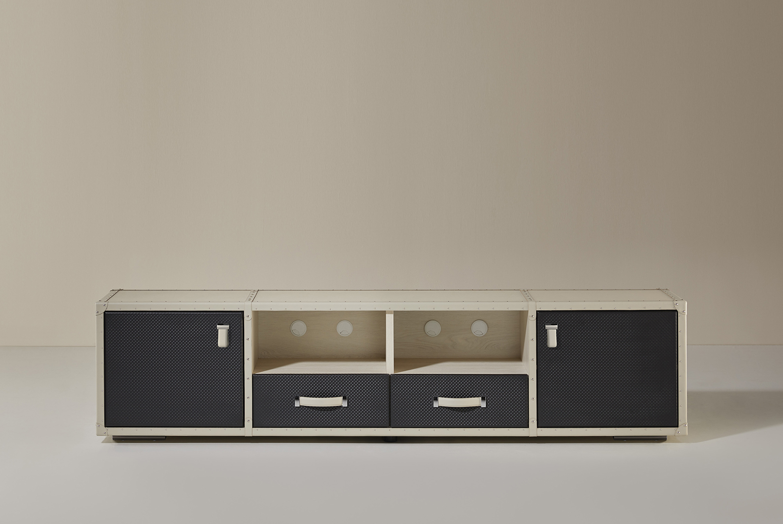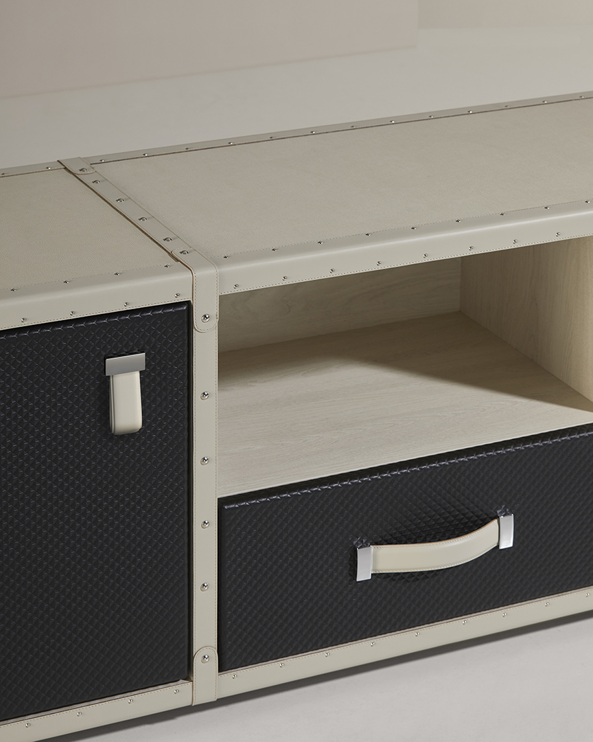 Mueble televisor bajo Traveler con gran capacidad de almacenaje gracias a sus dos cajones y dos puertas. También tiene un espacio para dispositivos o para tener a mano libros u otros objetos.