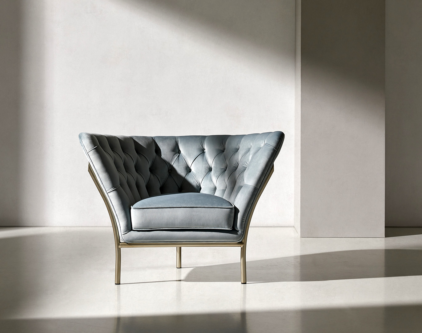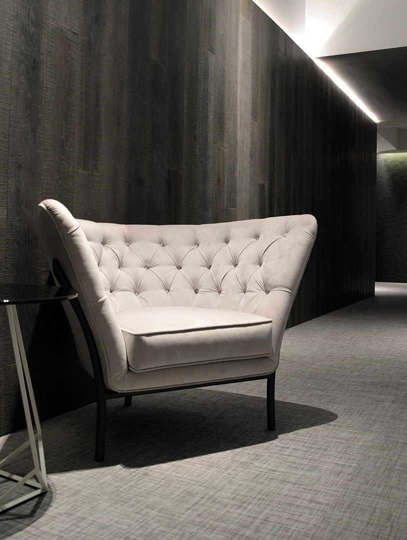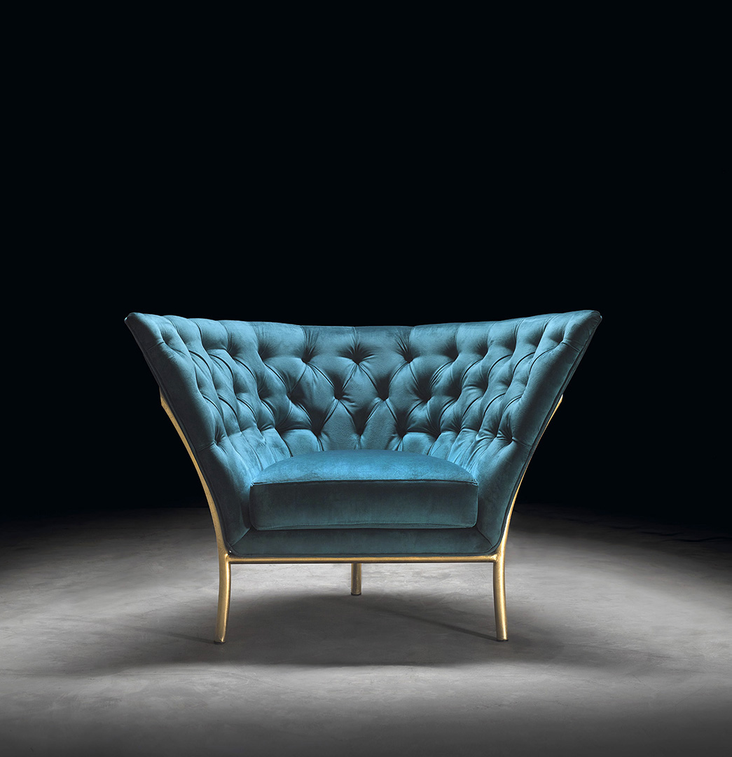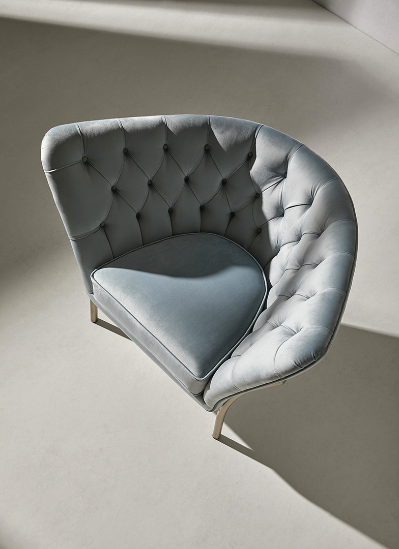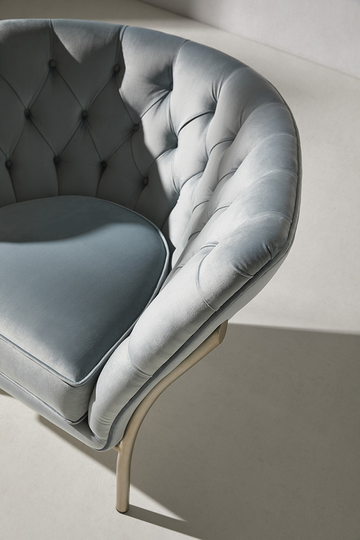Sus tres patas le dan un aire etéreo sin hacerle perder estabilidad, mientras que su respaldo envolvente hace del sillón Flute una pieza acogedora y cómoda. El clasicismo del tapizado artesanal en capitoné aúna a la perfección con su moderna base de hierro, convirtiéndolo en un sillón ecléctico que se puede incorporar en ambientes de cualquier estilo.