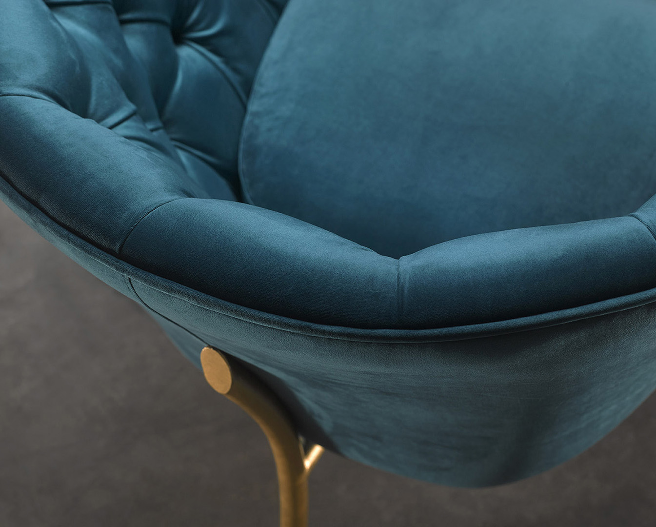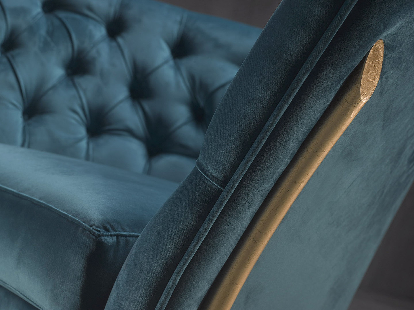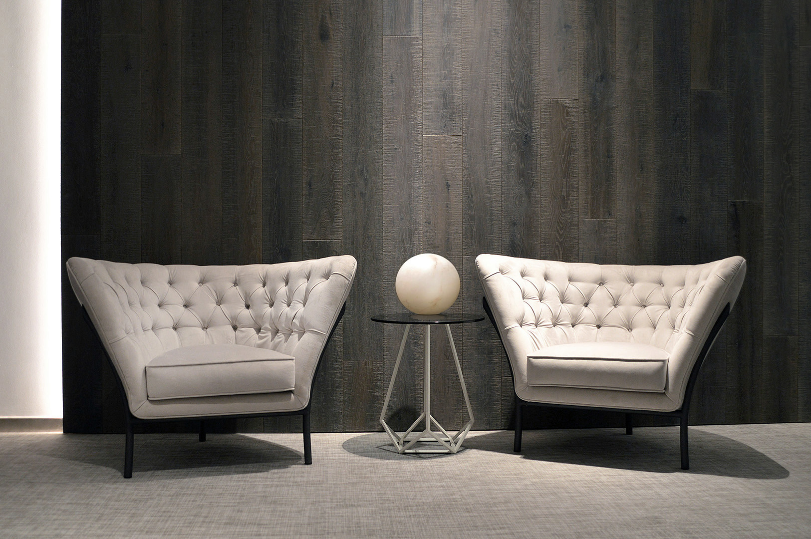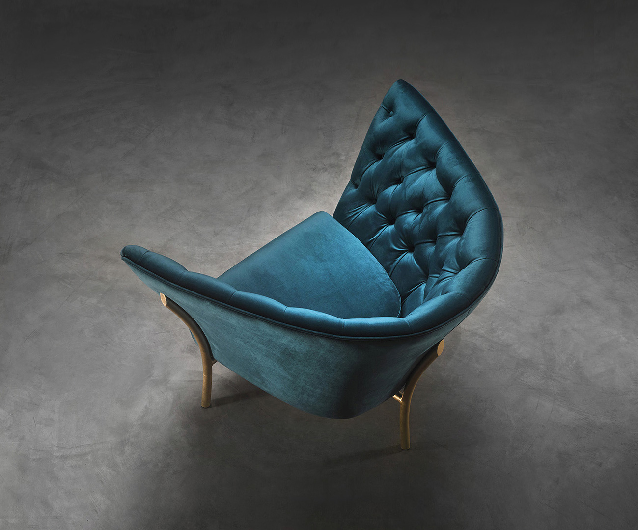 Sus tres patas le dan un aire etéreo sin hacerle perder estabilidad, mientras que su respaldo envolvente hace del sillón Flute una pieza acogedora y cómoda. El clasicismo del tapizado artesanal en capitoné aúna a la perfección con su moderna base de hierro, convirtiéndolo en un sillón ecléctico que se puede incorporar en ambientes de cualquier estilo.
