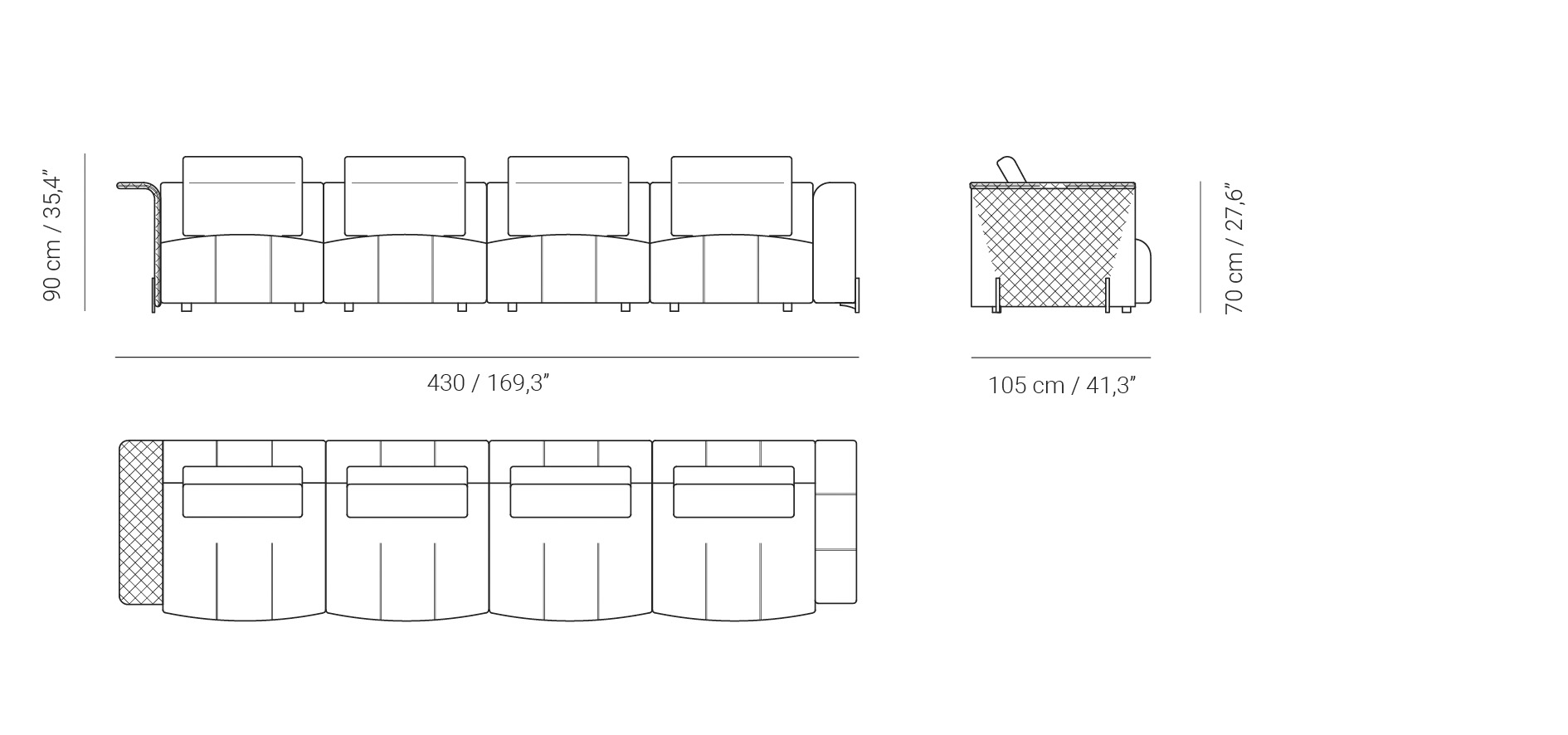 La colección Bellagio permite un alto grado de personalización. Dos opciones de traseras y brazos: recto y ancho, mantiene una estética más contemporánea, o curvo y ligero, aporta originalidad al diseño. Disponible una amplia gama de telas y pieles para el tapizado. Las patas metálicas se fabrican en diferentes acabados.