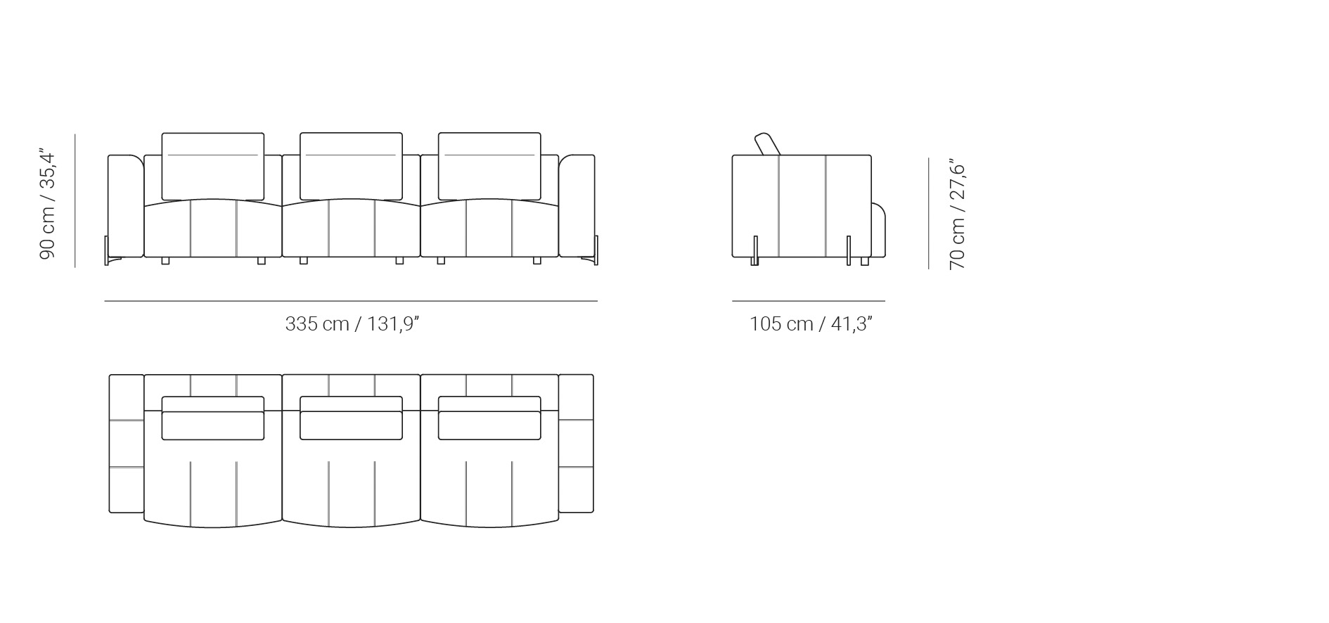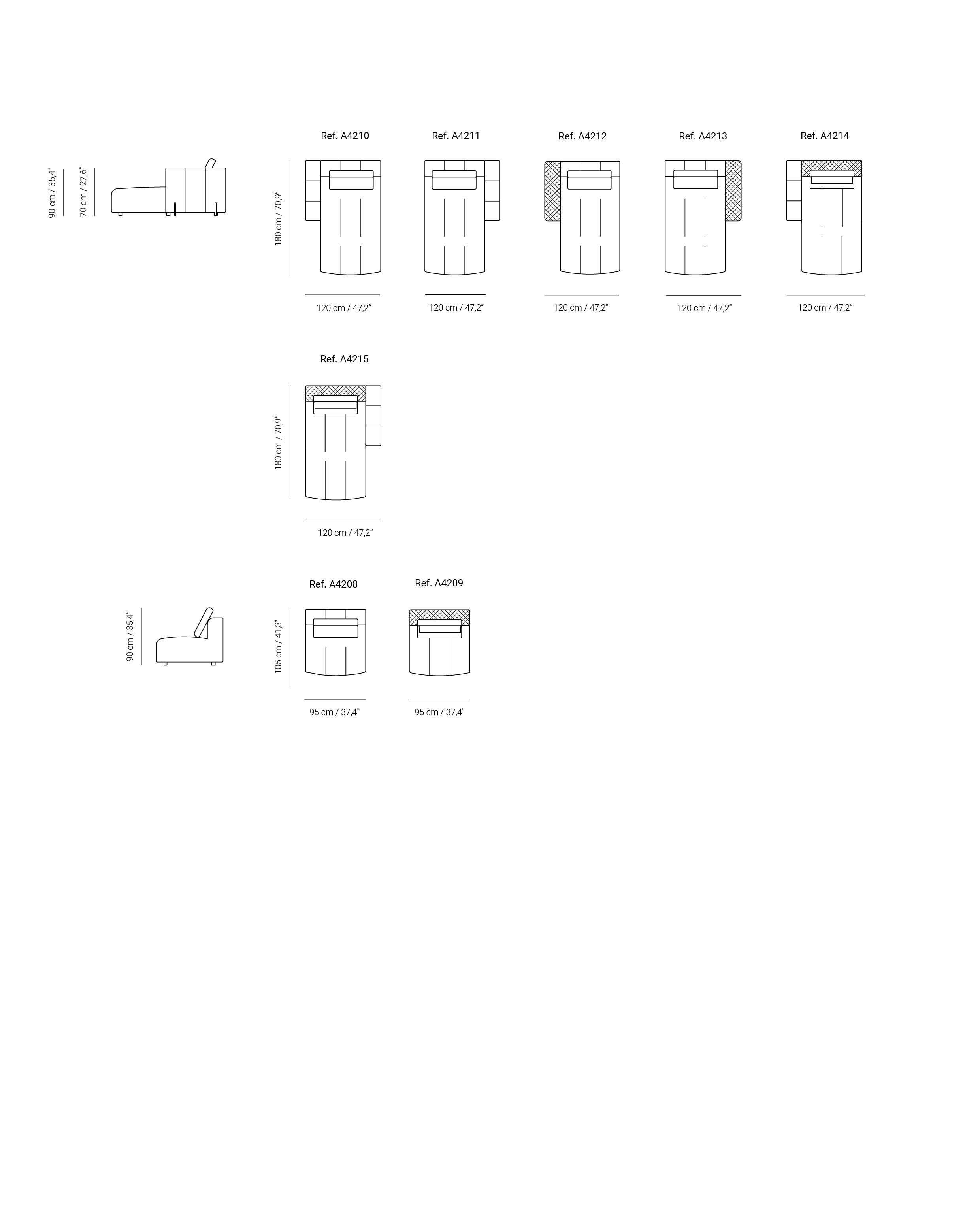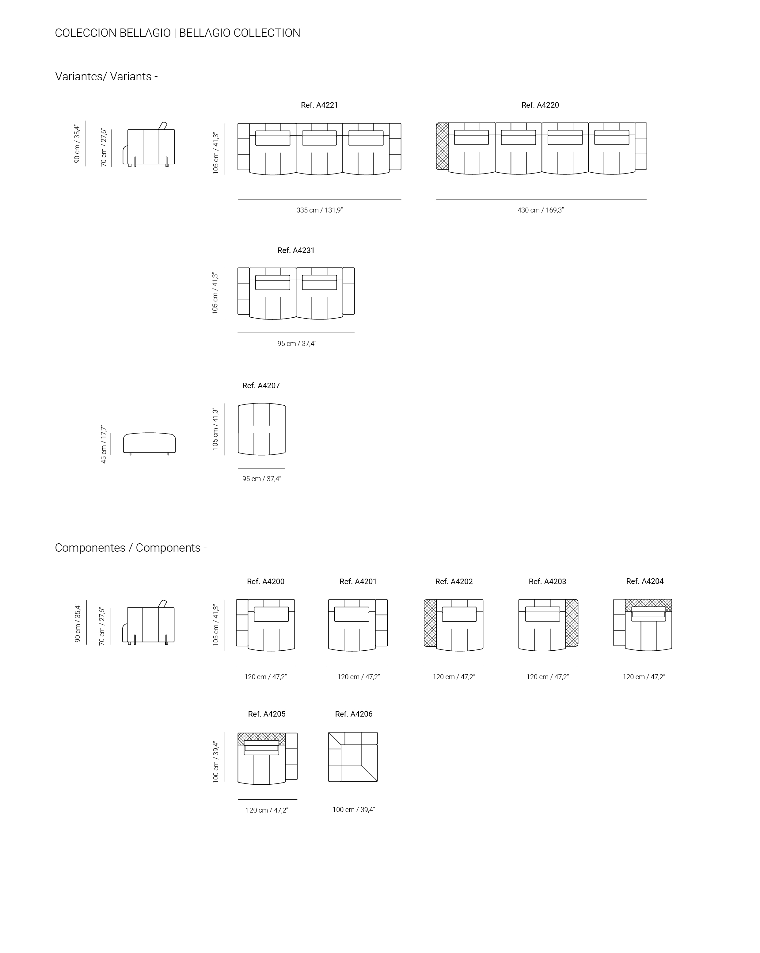 La colección Bellagio permite un alto grado de personalización. Dos opciones de traseras y brazos: recto y ancho, mantiene una estética más contemporánea, o curvo y ligero, aporta originalidad al diseño. Disponible una amplia gama de telas y pieles para el tapizado. Las patas metálicas se fabrican en diferentes acabados.