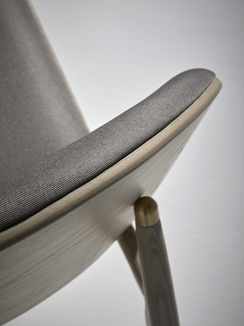 Fabricado en madera de fresno, se puede personalizar con diferentes acabados y tapizar con una amplia selección de telas o piel.