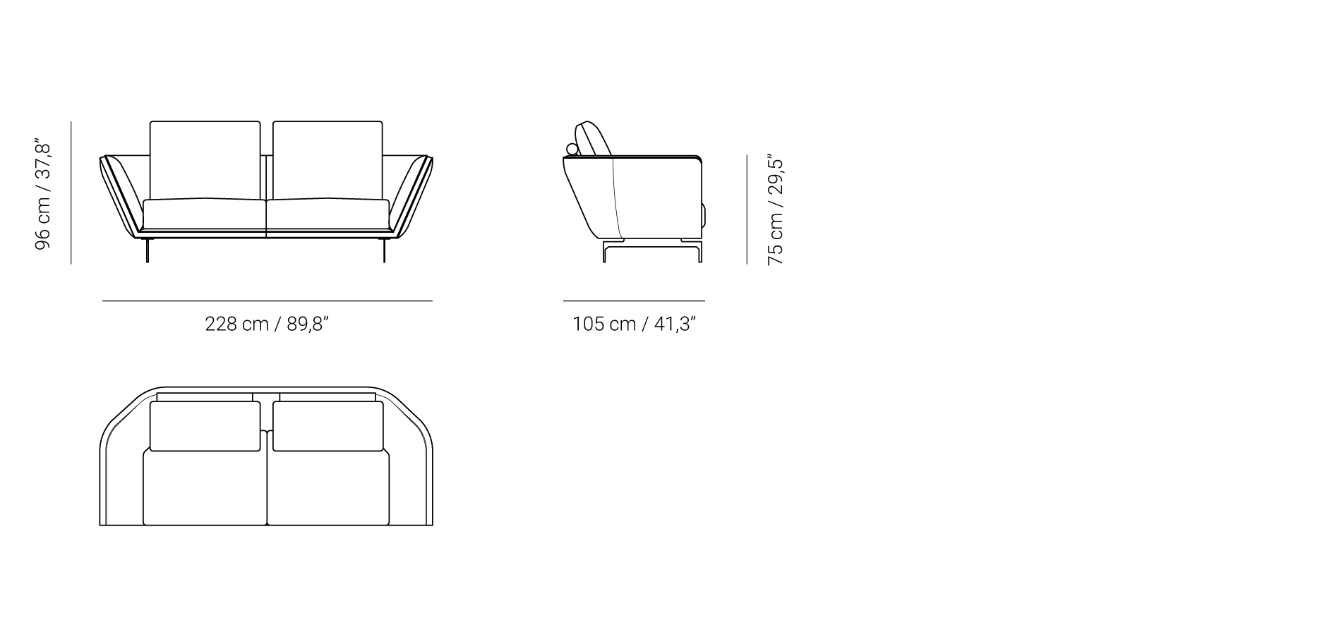 Un sofá pensado para el confort, con una geometría generosa, que usa los ángulos inclinados para mejorar la ergonomía. Una pieza muy reconocible, con detalles en cada parte del modelo.