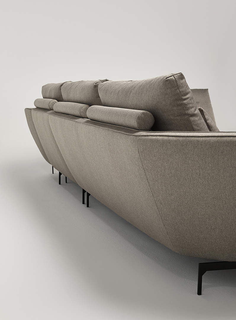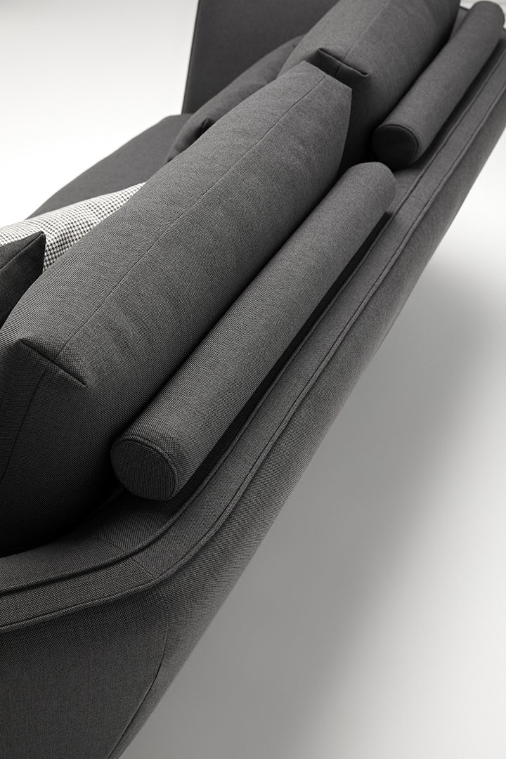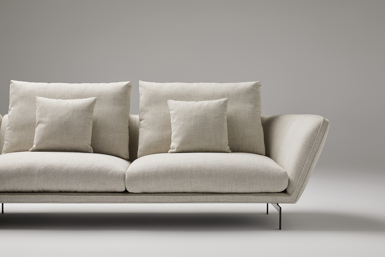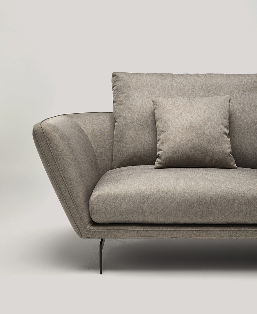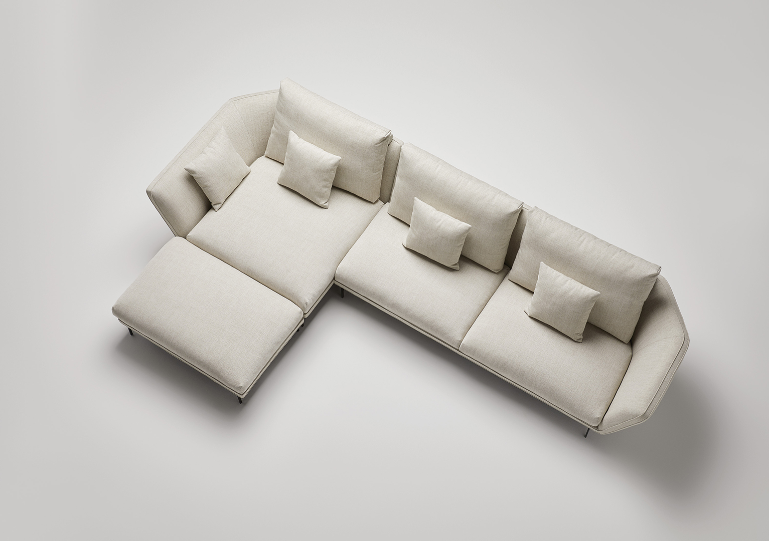 Un sofá pensado para el confort, con una geometría generosa, que usa los ángulos inclinados para mejorar la ergonomía. Una pieza muy reconocible, con detalles en cada parte del modelo.