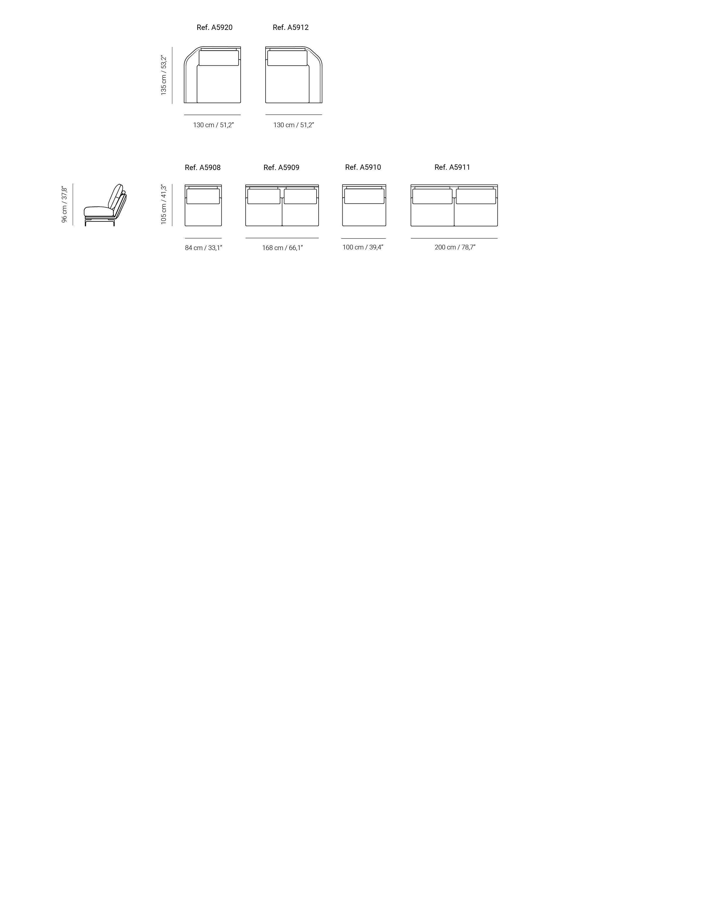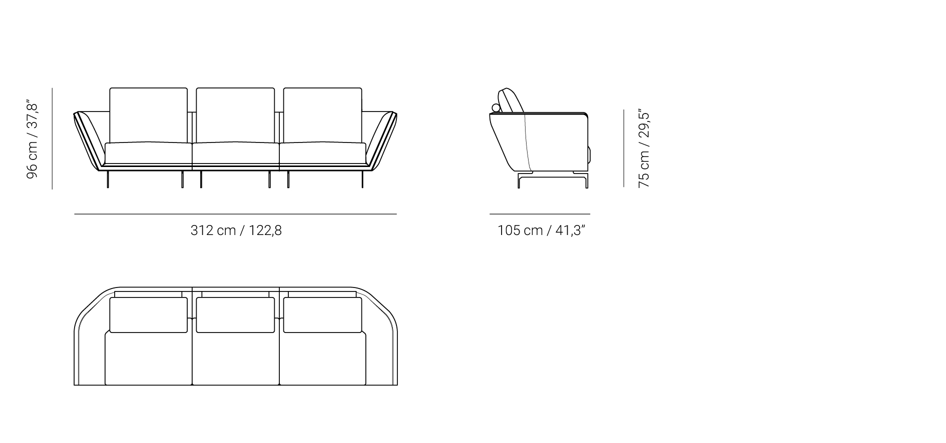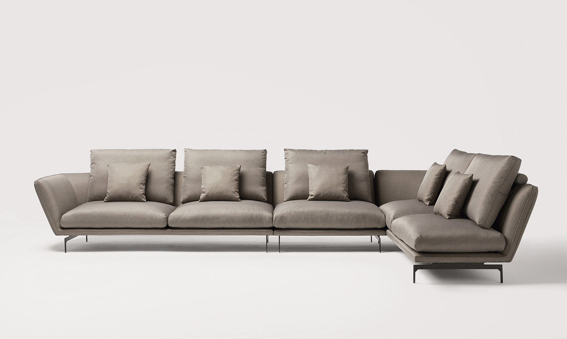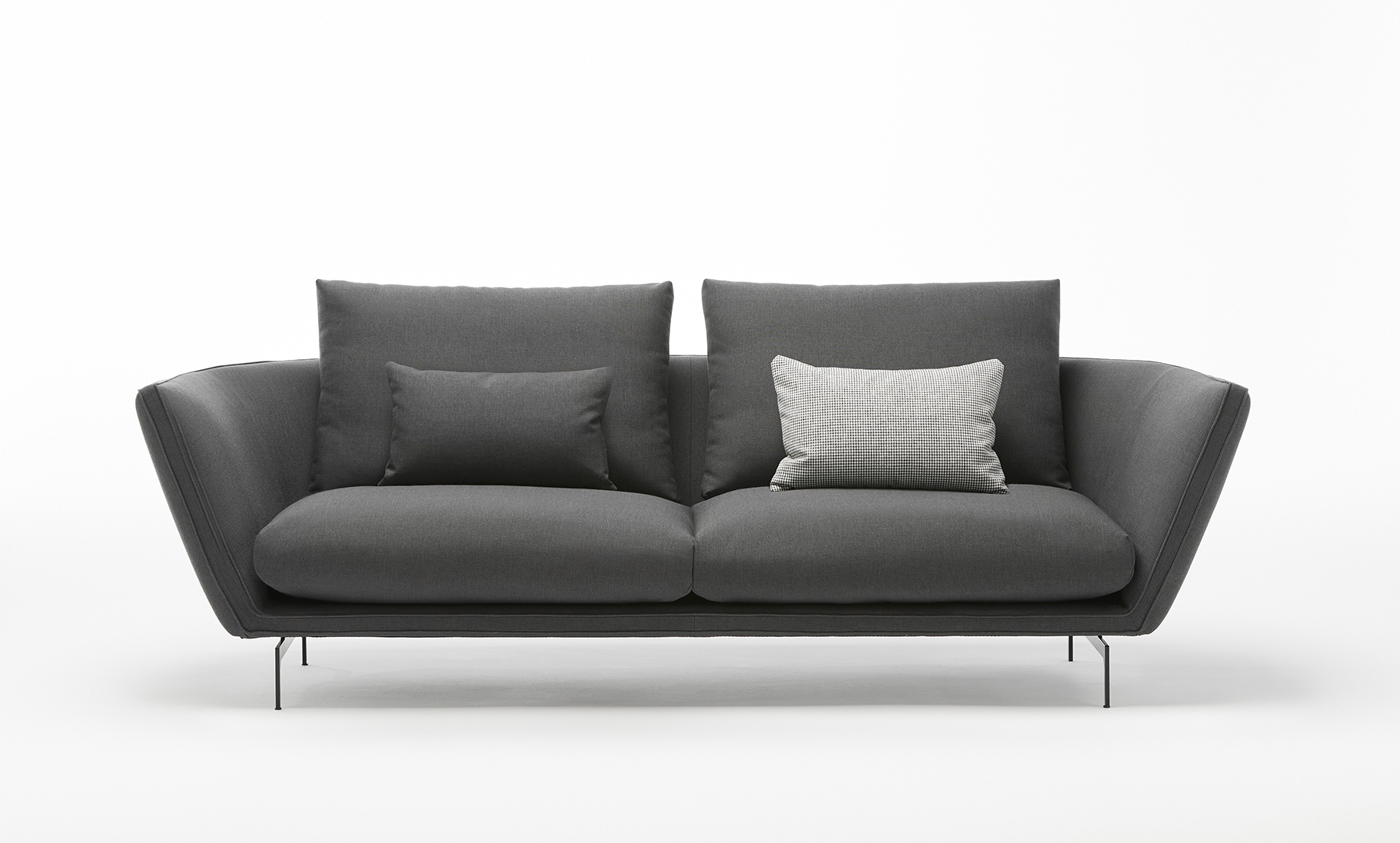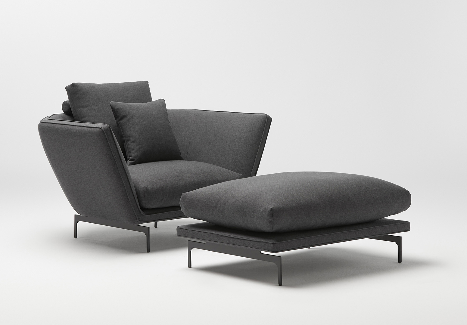Un sofá pensado para el confort, con una geometría generosa, que usa los ángulos inclinados para mejorar la ergonomía. Una pieza muy reconocible, con detalles en cada parte del modelo.