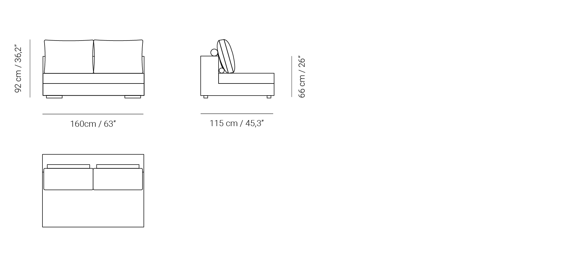 El módulo Prince de 160cm puede usarse tanto como un ligero sofá de 2 plazas sin brazos o coordinarse con otras piezas para configurar un sofá modular.
