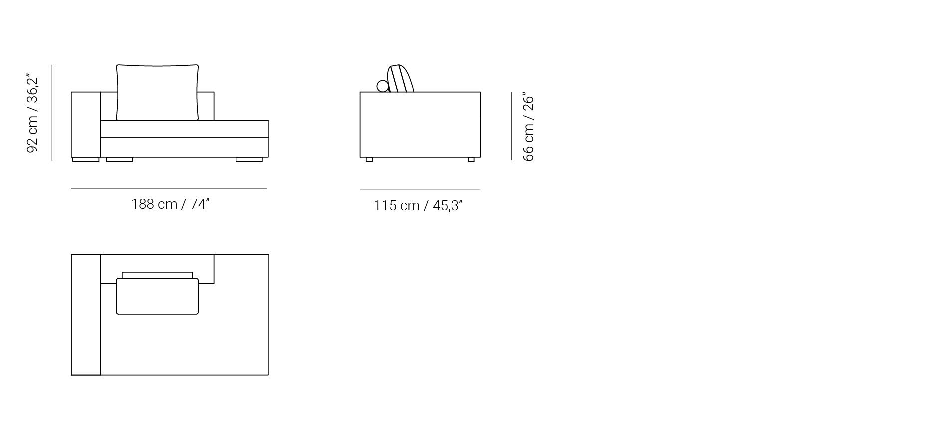 Moderno diván con brazo a la izquierda de líneas rectas. Se puede coordinar con otros módulos del sofá Prince.