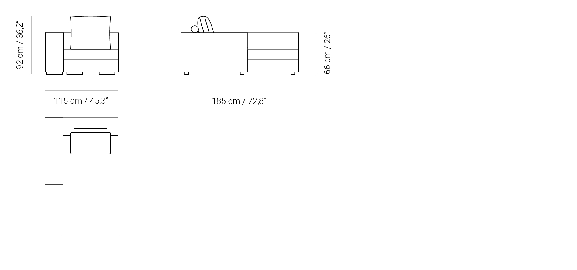 Chaise longue con brazo izquierdo para uso individual o en conjunto con el sofá modular Prince.