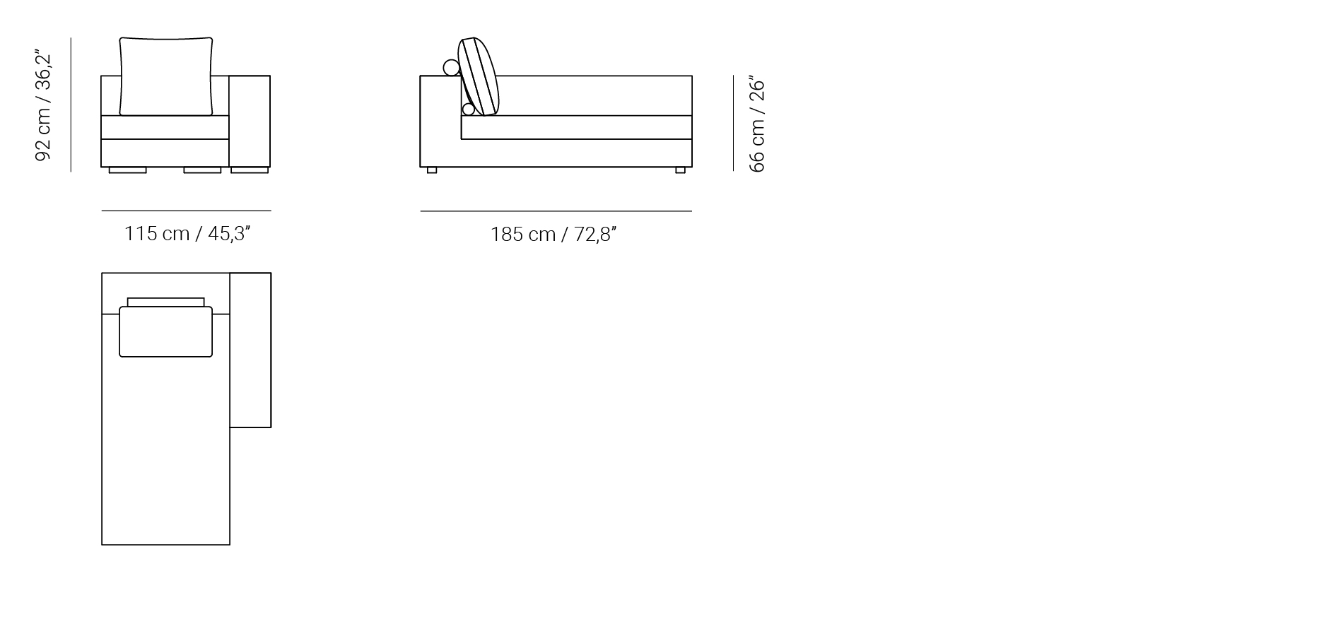Chaise longue con brazo derecho para coordinar con los sofás modulares Prince o para uso individual.