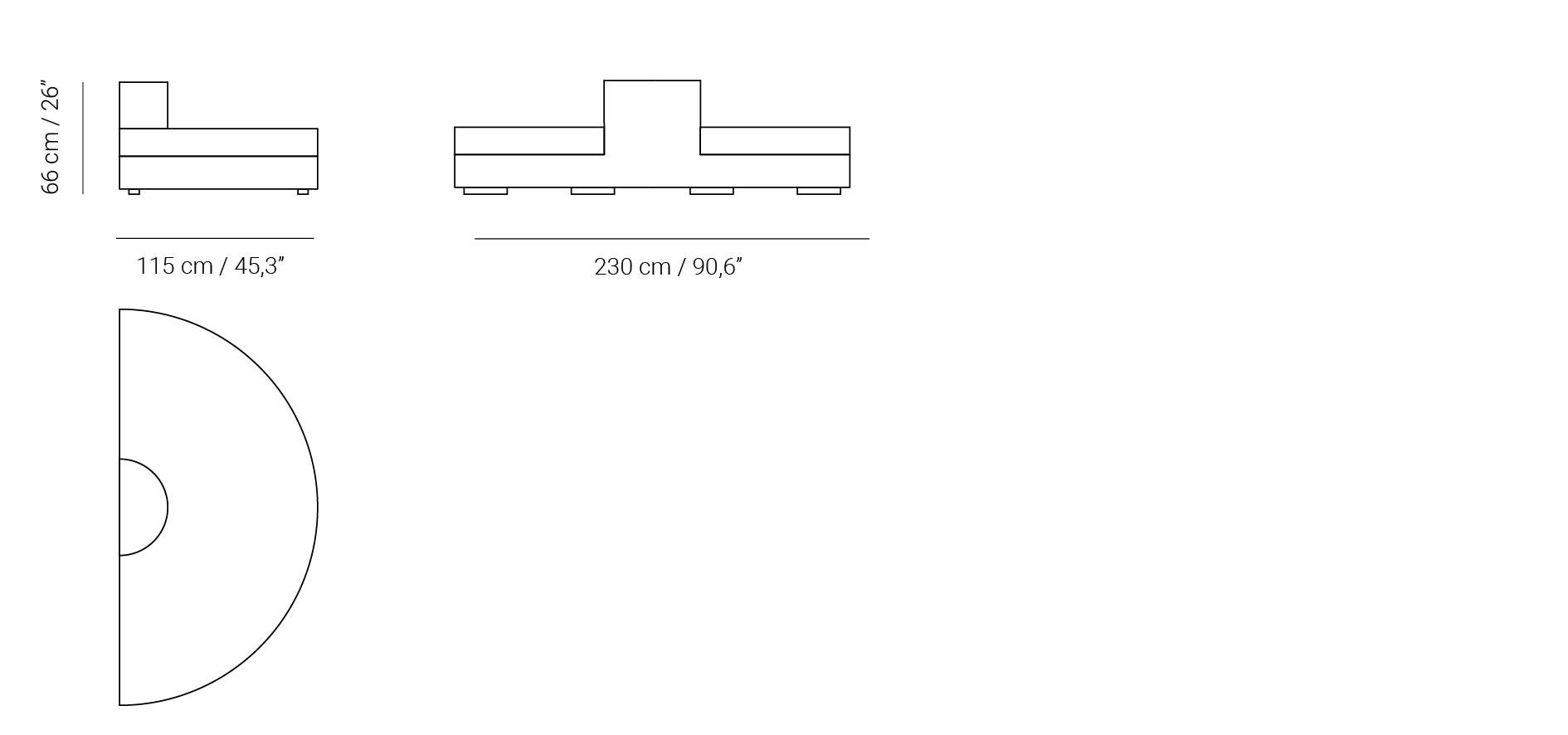 Módulo semicircular Prince, perfecto para crear composiciones de sofá con forma ovalada o redonda.