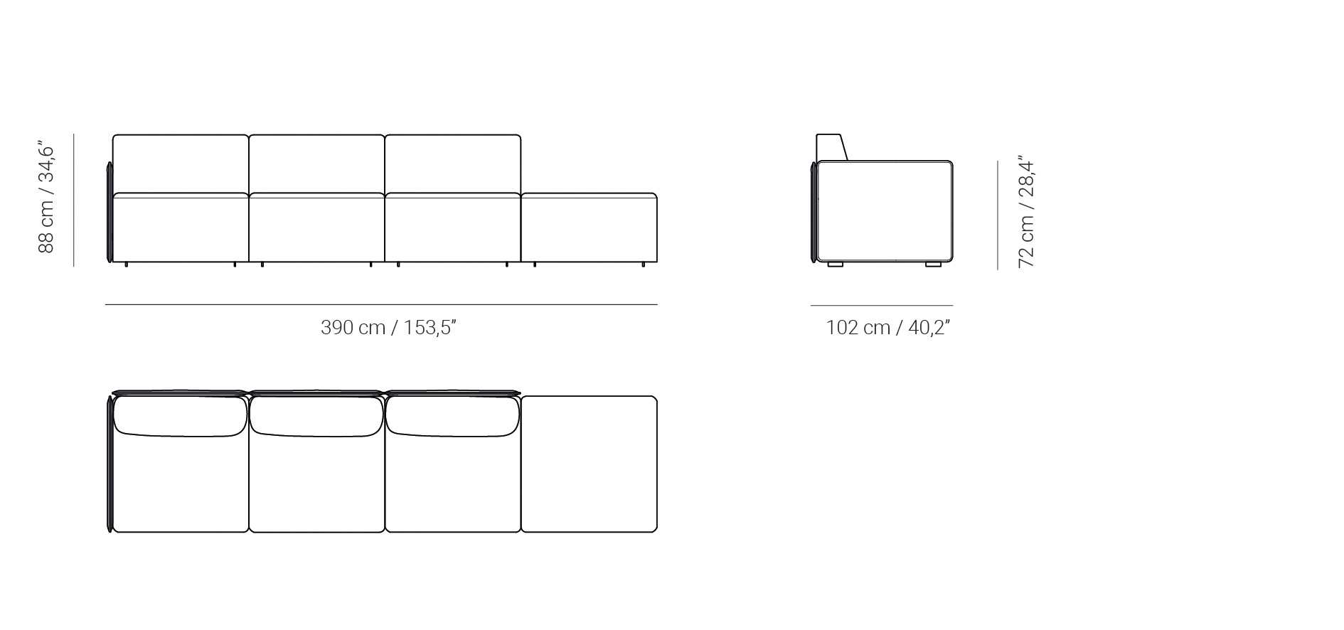 Composición de sofá modular Tempo formada por un módulo con brazo a la izquierda, dos módulos centrales y un puff. Tempo nace de la pasión por la artesanía, la fascinación por la historia y la exaltación de la tradición. Creada con materiales naturales por la nobleza que encierran en sí mismos. Materiales que mejoran con la evolución del tiempo manifestando elegantes matices, deleitando a los amantes del lujo sobrio y la armonía.